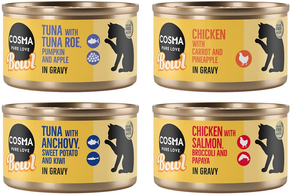 Konzervy Cosma Bowl představují pro vaši kočku speciální pochoutku: díky vysokému obsahu masa, čerstvým surovinám, chutným kouskům a kuřecí nebo rybí omáčce jsou ideální volbou pro plnohodnotnou stravu. Toto prémiové krmivo pro kočky obsahuje pouze vybrané suroviny, které byly připraveny mimořádně šetrně – důležité živiny a nefalšovaná přírodní chuť Cosma Bowl tak zůstávají zachovány. Přesvědčte se sami o chutném složení Cosma Bowl: Přírodní a čerstvé suroviny v šetrné úpravě Vysoký obsah masa 42 %: chutné druhy masa a ryb dodávají vaší kočce cenné bílkoviny způsobem vhodným pro daný druh a slibují vysokou stravitelnost Obohaceno o kousky ovoce a zeleniny Lehká kuřecí nebo rybí omáčka pro příjemný příjem tekutin Zcela bez přídatných látek: bez jakýchkoli dochucovadel, konzervantů a barviv Přispívá k druhově vhodné stravě Vhodné pro citlivé a vybíravé kočky: Cosma Bowl se skládá pouze z několika vybraných ingrediencí Pro dospělé kočky Pro zcela výjimečný chuťový zážitek a plnohodnotný požitek pro vaši kočku! Cosma Bowl je k dispozici ve 4 lahodných příchutích: Kuřecí prsa s mrkví a ananasem Kuřecí prsa s lososem, brokolicí a papájou Tuňák s jikrami z tuňáka, dýní a jablkem Tuňák s ančovičkami, batáty a kiwi Pestré míchané balení obsahuje: 2x Tuňák s jikrami z tuňáka, dýní a jablkem 2x Kuřecí prsa s mrkví a ananasem 1x Kuřecí prsa s lososem, brokolicí a papájou 1x Tuňák s ančovičkami, batáty a kiwi Objevte Cosma Bowl a hýčkejte svou kočku spoustou lásky se značkou Cosma!