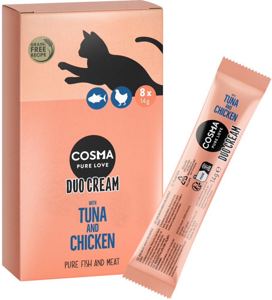 Objevte neodolatelné pamlsky Cosma DUO Cream! Nyní ve výhodném úsporném balení! Tato speciální svačinka kombinuje dvě lahodné příchutě a dva zdroje bílkovin v jednom výrobku. Díky krémové konzistenci je tato pochoutka dokonalým pamlskem pro vaši sametovou tlapku a můžete ji jednoduše podávat přímo ze sáčku. Ideální jako svačina mezi jídly nebo jako lahodná příloha k dennímu jídlu. Cosma DUO Cream Snack v sáčku o hmotnosti 14 g je k dispozici ve 3 lahodných příchutích: Tuňák a kuřecí Losos a kuřecí Kachna a kuřecí Pestré míchané balení obsahuje: 9 x tuňák a kuřecí 9 x kachna a kuřecí 6 x losos a kuřecí Vyzkoušejte si náš Cosma DUO Cream Snack: Prémiová svačinka pro dospělé kočky všech plemen Dvojnásobné potěšení: kombinace dvou lahodných chutí v jedné svačině Každá odrůda obsahuje dva zdroje živočišných bílkovin S krémovou texturou Jako svačina mezi jídly nebo jako lahodná poleva Bez umělých konzervačních látek, barviv a aromat Objevte nyní Cosma DUO Cream Snacks a hýčkejte svou kočku spoustou lásky a pamlsky Cosma ! Objevte naše granule Cosma: Koupit levné granule pro kočky | zoohit Objevte naše vlhké krmivo Cosma: Koupit levné vlhké krmivo pro kočky online | zoohit