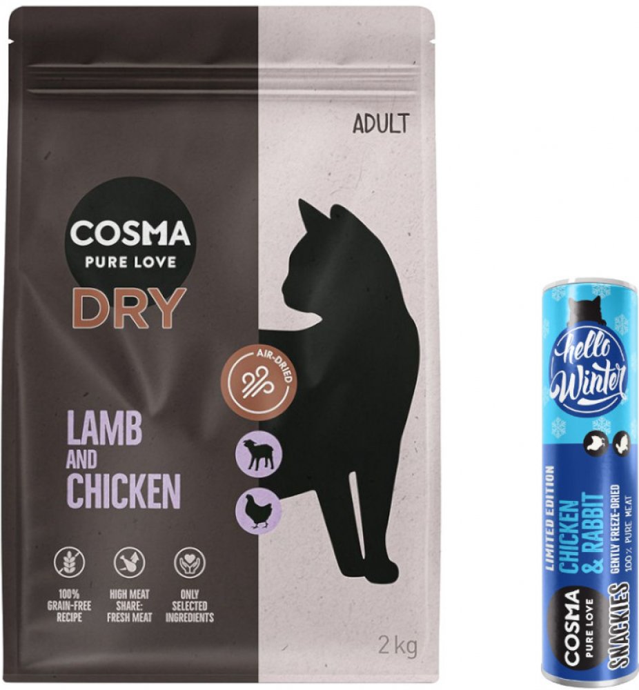 PRVNÍ SUCHÉ KRMIVO COSMA PRO KOČKY! Objevte naše plnohodnotné a vzduchem sušené krmivo Cosma Premium: vaše kočka si ho zamiluje! .product-description__grid-wrapper { width:100%; display:inline-grid; grid-template-columns: 1fr 1fr; grid-gap: 20px; } @media (max-width: 500px) { .product-description__grid-wrapper { grid-template-columns: 1fr; } } Váš tygřík si zaslouží jen to nejlepší – a přesně to nabízí naše nové suché krmivo Cosma Premium! S 80 % vysoce kvalitního čerstvého masa a vnitřností a pečlivě vybranými ingrediencemi! Naše jedinečná receptura bez obilovin obsahuje dva vysoce kvalitní hlavní zdroje bílkovin. Ty poskytují všechny esenciální aminokyseliny, které podporují vývoj a udržování svalů vašeho mazlíčka! A co je nejlepší, šetrný proces sušení na vzduchu zachovává další živiny, aby váš miláček dostal vše, co potřebuje. Suché krmivo Cosma obsahuje také důležitá prebiotika, která podporují vstřebávání živin. Suché krmivo Cosma je kompletní, plnohodnotné krmivo pro dospělé kočky všech plemen – bez umělých přísad! Láska, která vaší kočce zachutná! Suché krmivo Cosma je k dispozici ve 4 lahodných příchutích: Hovězí a kuřecí se šťavnatými rajčaty a banánem Kachna a kuřecí s lahodnou červenou řepou a jablkem Jehněčí a kuřecí s chutným špenátem a hruškou Losos a kuře s delikátní brokolicí a borůvkami Náš tip: Varianta s lososem a kuřecím je k dispozici také v praktické zkušební velikosti 80 g. Vyzkoušejte nyní! Přesvědčte se sami o našem novém suchém krmivu Cosma: Kompletní prémiové kompletní krmivo pro dospělé kočky všech plemen Inovativní a šetrné sušení na vzduchu zachovává důležité živiny pro vaši kočku Stejně jako naše oblíbené mokré krmivo: čisté receptury s vysokým obsahem masa a bez zbytečných příkras S 80 % čerstvého masa a vysoce kvalitních vnitřností S chutným ovocem a zeleninou Receptura 100% bez obilovin S důležitými prebiotiky: podporují vstřebávání živin Bez umělých konzervantů, barviv a dochucovadel Vyzkoušejte naše suché krmivo Cosma Premium a kombinujte ho s oblíbeným mokrým krmivem Cosma – vaše kočka si ho zamiluje! Objevte naše vlhké krmivo Cosma: Výhodně koupit vlhké krmivo pro kočky | zoohit Objevte naše pamlsky Cosma: Výhodně koupit pamlsky pro kočky | zoohit Využijte naší skvělé nabídky! Pouze po omezenou dobu: nyní při koupi 2 kg granulí Cosma získáte skvělou slevu! Neopomeňte prosím, že se uvedená nabídka vztahuje pouze na produkt č. 2229262.