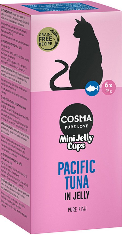Nové Cosma Mini Jelly Cups: perfektní svačinka mezi jídly. Tyto čisté snacky se skládají z jemných kuřecích prsou, tichomořského tuňáka a mořských plodů ve šťavnatém želé. Přirozeně bez obilovin a bez umělých přísad. Stačí podávat kočce jako šťavnatou a chutnou svačinku mezi jídly. Vyberte si ze 4 lahodných příchutí a míchaného balení. Míchané balení obsahuje: 8 x tichomořský tuňák, 8 x kuřecí prsa, 4 x tuňák/krab a 4 x kuřecí/krevety. Cosma Mini Jelly Cups: čistá kočičí svačinka bez obilovin jemné kuřecí, ryby a mořské plody ve šťavnatém želé perfektní svačinka mezi jídly Rozmazlujte svou kočku spoustou lásky a značkou Cosma!