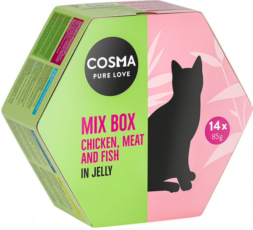 Cosma Original a Cosma Asia jsou vysoce kvalitní prémiová mokrá krmiva pro dospělé kočky přinášející neodolatelný chuťový zážitek. Pečlivě vybrané suroviny jsou zpracovány za čerstva a nabízí Vašemu miláčkovi s Cosma Original čistý masový nebo rybí požitek a s Cosma Asia exotickou kombinaci zjemněnou lehkou rýží. Cosma Original ze spousty šťavnatého masa nebo delikatesní ryby v chutném želé. Každý druh obsahuje pouze jeden zdroj bílkovin ve formě vysoce kvalitního masa nebo ryby. Díky šetrné přípravě vybraných surovin si krmivo zachovává všechny důležité živiny a nefalšovanou, přírodní chuť. Toto doplňkové krmivo z přírodních a vysoce kvalitních surovin je vyrobeno bez dochucovadel, konzervačních látek a barviv. Díky tomu zajišťuje nezaměnitelný chuťový zážitek a přirozenou výživu. Cosma Asia je prémiové doplňkové krmivo z pečlivě vybraných přírodních surovin. Toto krmivo pro kočky neobsahuje umělé konzervanty a samozřejmě neobsahuje ani zvýrazňovače chuti. Cosma Asia se skládá ze světlých kousků masa, které jsou zpracovány za čerstva s trochou rýže, která jim dodává lehký exotický nádech. Cosma Mix Box obsahuje 14 konzerv à 85 g v následujících chutných provedeních: 2 x Original kuřecí: šťavnatá kuřecí prsa 1 x Original tichomořský tuňák: chutné červené a světlé maso z tuňáka 1 x Original tuňák pruhovaný: vybrané světlé maso z tuňáka 1 x Original losos: jemné kousky z lososa 2 x Asia tuňák s krabím masem: světlé maso z tuňáka s lehce stravitelným krabím masem 2 x Asia kuře s kuřecími játry: delikatesní kousky kuřete se zdravými kuřecími játry 1 x Asia kuře s tuňákem: delikatesní kousky kuřete se světlým masem z tuňáka 1 x Asia tuňák s lososem: chutný tuňák s nejjemnějším lososem 1 x Asia tuňák s hovězím: vybraný tuňák s delikátním hovězím Další informace o produktech naleznete zde: Cosma Original in Jelly Cosma Thai/Asia in Jelly