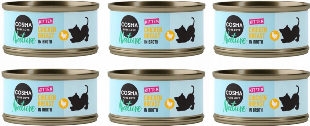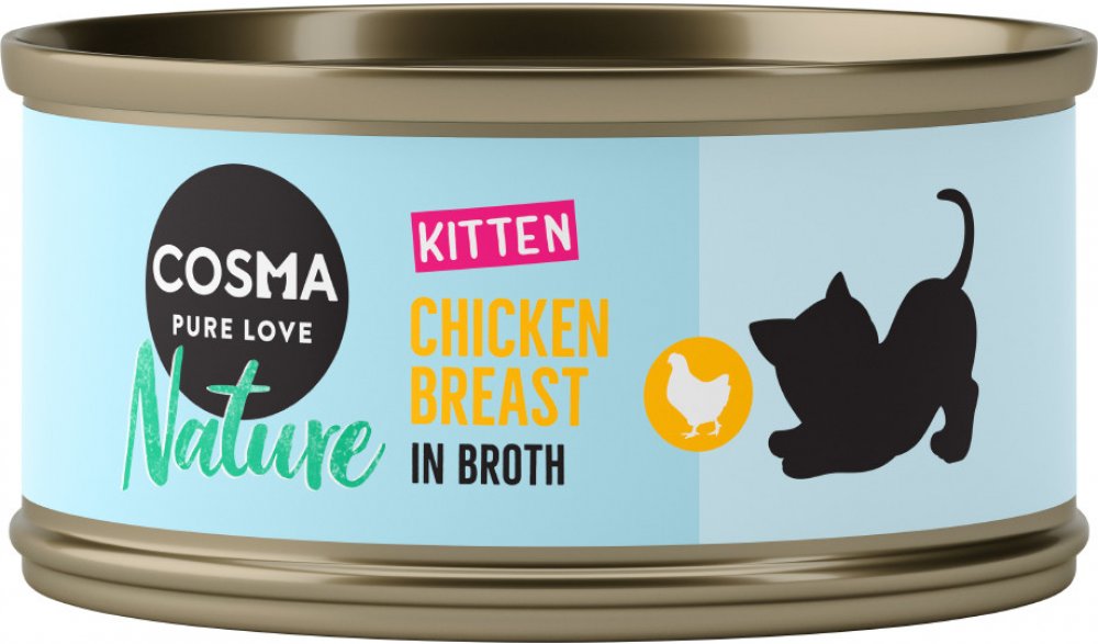 Cosma Nature Kitten je krmivo vyrobené z vysoce hodnotných přírodních surovin, které poskytuje dospívajícím koťatům jedinečný chuťový zážitek. Toto přírodní krmivo se vyznačuje velmi vysokým obsahem masa nebo ryby ve výši 50 %. Všechny složky jsou jemně dušené ve vlastní šťávě.