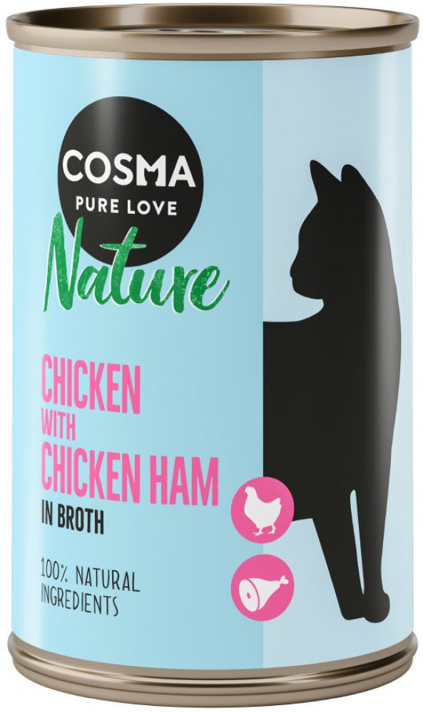 Cosma Nature je přírodní krmivo pro kočky s vysokým podílem ryb nebo masa až 75%. Velké množství různých kombinací s delikátním tuňákem, jemným kuřecím filetem či s vynikajícím lososem - také v kombinací s krevetami, kuřecí šunkou či sýrem - se postará a pestrost v misce kočky. Všechny přísady jsou dušené ve vlastní šťávě. Díky tomu zůstává zachovaná nefalšovaná a čistá chuť - pro mimořádný zážite...