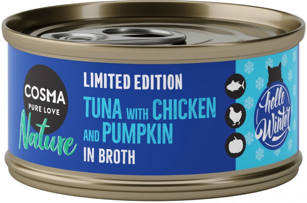 Rozmazlujte svého kočičího miláčka i v chladném období roku: Chutný tuňák, šťavnatá kuřecí prsa a lahodná dýně kočce připraví neodolatelný chuťový zážitek! Cosma Nature je přírodní krmivo s vysokým podílem masa nebo ryb. Všechny přísady jsou dušeny ve vlastní šťávě. Díky tomu zůstává zachována neodolatelná, nefalšovaná, čistá chuť přírody. Přesvědčte se i Vy o kvalitách krmiva Cosma Nature a nabíd...