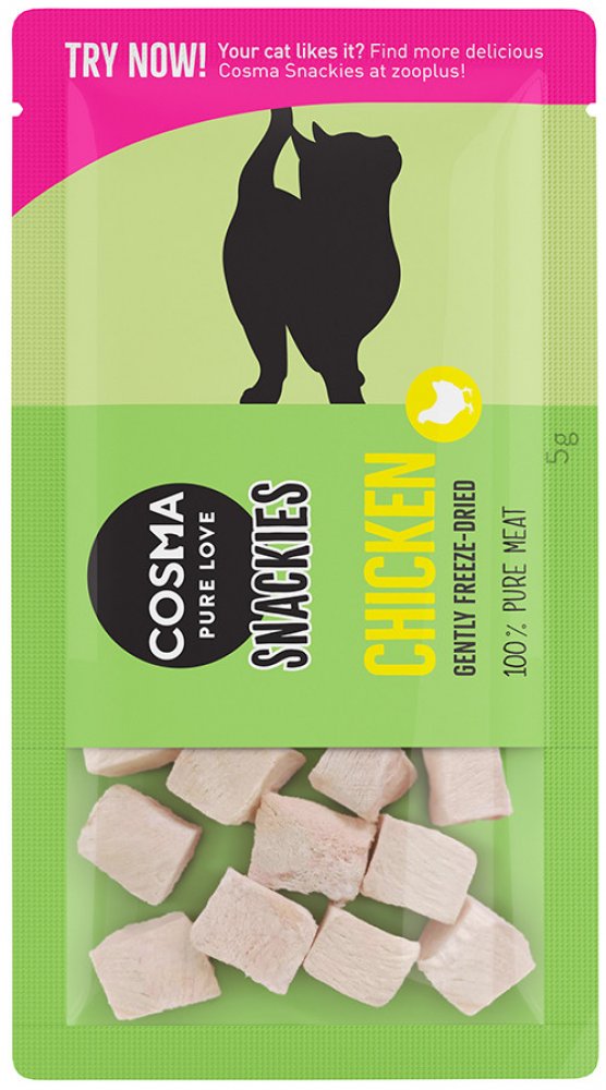 Cosma Snackies: 100% čisté maso nebo ryby Přírodní pamlsky pro kočky ze 100% čistého masa nebo ryb, které jsou obzvláště dobře přijímány i vybíravými kočkami! Cosma Snackies jsou vyráběny obzvláště šetrným a důmyslným procesem sušení mrazem, který zachovává všechny důležité živiny a chutě pro Vašeho domácího mazlíčka. Během tohoto procesu je z masa nebo ryb během minimálního působení tepla po delší dobu odebírána voda, díky čemuž zůstane zachována plná a intenzivní chuť pro Vašeho tygříka. Vaše kočka si pochutná na vysoké kvalitě, protože Cosma Snackies jsou vyrobeny z masa nebo ryb, které jsou vhodné pro lidskou spotřebu. Sušené a přírodní pamlsky pro kočky čistě z masa nebo ryb jsou velmi oblíbené u chovatelů a veterinářů, protože jsou zdravé a díky své přirozené chuti vynikají dobrou akceptací. Pamlsky lze podávat několikrát denně jako svačinku nebo jimi můžete posypat krmivo. Vaše kočka si zamiluje čistou chuť! Kočky milují Cosma Snackies, miluje je i Vaše kočka?