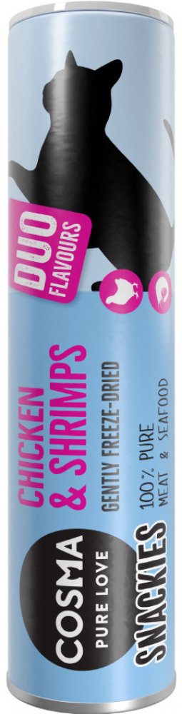 Dobrá zpráva: oblíbené pamlsky Cosma Snackies přicházejí v novém designu! Ve fázi přechodu na nové balení může Vaše objednávka obsahovat produkty v původním i v novém designu. Cosma Snackies DUO nenabízejí pouze čistou, přírodní chuť, ale také dvojí požitek. Neboť v jednom balení naleznete dvě kvalitní příchutě najednou: 100 % nejlibovějších kuřecích prsou a dle vybraného druhu pak kousky tuňáka, kuřecích jater nebo krevety. Tento snack tedy bude Vašemu miláčkovi chutnat dvakrát tak dobře. Nyní navíc za výhodnou cenu! Cosma snackies jsou zpracovány za speciálního procesu zvaného lyofilizace, a to proto, aby zůstaly zachovány všechny důležité živiny a přirozená chuť, což Vás miláček jistě ocení. Při tomto procesu je od masa nebo ryby oddělena voda za působení mrazu po dlouhou dobu, přičemž tedy zůstává zachována intenzivní chuť obsažených surovin. Vaší kočce bude jistě tato kvalita vyhovovat, neboť krmivo Cosma je vyrobeno z masa, které bylo určeno pro lidskou spotřebu. Cosma snackies DUO výhodné balení nabízí tyto varianty: 5 x 23 g kuřecí prsa & krevety (115 g): 75 % kuřecích prsou, 25 % krevet pro všechny labužníky 5 x 26 g kuřecí prsa & tuňák (130 g): 75 % kuřecí prsa , 25 % filety z tuňáka pro milovníky ryb 5 x 28 g kuřecí prsa & kuřecí játra (140 g): 75 % kuřecí prsa , 25 % kuřecích jater pro milovníky drůbeže Mrazem sušené snacky z čistého masa nebo ryb jsou obzvláště oblíbené u zvěrolékařů a chovatelů koček, protože nabízejí zdravé mlsání s přírodní chutí, které navíc nedráždí trávení kočky. Báječné Cosma snacky DUO jsou dodávány ve znovuuzavíratelné tubě, díky níž zůstane zachována čerstvost i chuť. Snacky můžete podávat vícekrát denně mezi jídly nebo na krmivo. Vaše kočka bude tuto chuť přírody milovat! S Cosma snacky DUO přichází jedinečný produkt, kterému Vaše kočka neodolá.