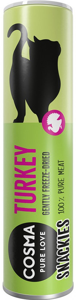 Cosma Snackies: 100% čisté maso nebo ryby Nyní v cenově dostupném výhodném balení! Přírodní kočičí snack z čistého masa nebo ryb, který je obzvláště dobře přijímán i vybíravými kočkami! Cosma Snackies jsou vyráběny obzvláště šetrným a důmyslným procesem lyofilizace, aby si zachovaly všechny důležité živiny a chutě pro vašeho mazlíčka. Při tomto procesu se z masa nebo ryb po delší dobu při nízké teplotě odstraňuje voda, což zachovává plnou a intenzivní chuť. Vaše kočka si pochutná na vysoké kvalitě, protože Cosma Snackies jsou vyrobeny z masa nebo ryb, které jsou vhodné i pro lidskou spotřebu. Pečlivě vybrané suroviny nabízejí vašemu labužníkovi jen to nejlepší a jsou k dispozici v následujících lahodných příchutích: 5 x kuře 26 g: lahodné kousky kuřecích prsou 5 x kachna 21 g: chutná kachna 5 x hovězí 23 g: vybrané kousky hovězího 5 x tuňák 25 g: jemné kousky filé z tuňáka 5 x losos 21 g: delikátní kousky filé z lososa 5 x králík 24 g: vynikající kousky králíka NOVINKA: 5 x krůtí 24 g: chutné kousky krůty Objevte naše lahodné a limitované speciální edice: 5 x Vánoční edice: kuře a kachna 25 g: lahodné kousky kuřecích prsou s kousky vánočních kachních prsou 5 x zimní edice: kuře a králík 26 g: lahodné kousky kuřecích prsou s kousky zimního králičího 5 x Letní edice: kuře a jehněčí 27 g: lahodné kousky kuřecích prsou s kousky letního jehněčího 5 x Let's Celebrate edice: treska 21 g: jemné kousky tresky pro extra porci oslavné nálady Mrazem sušené pamlsky z čistého masa nebo ryb jsou obzvláště oblíbené u veterinářů a chovatelů koček, protože nabízejí zdravé potěšení pro všechny tygříky a díky své přirozené chuti jsou obzvláště dobře přijímány. Oblíbené Cosma Snackies se dodávají v uzavíratelné tubě, což znamená, že přirozeně čerstvá chuť masa a ryb zůstává zachována po dlouhou dobu. Snackies lze podávat několikrát denně jako svačinku nebo je posypat na krmivo. Vaše kočka si tuto čistou chuť zamiluje! Kočky milují Cosma Snackies, miluje je i vaše kočka?