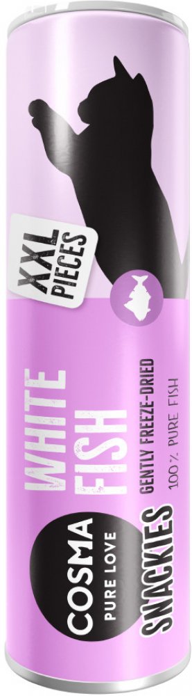 Dobrá zpráva: oblíbené pamlsky Cosma Snackies přicházejí v novém designu! Ve fázi přechodu na nové balení může Vaše objednávka obsahovat produkty v původním i v novém designu. Přírodní snack pro kočky je vyroben z čistého kuřecího masa či tuňáka. Kousky Cosma snackies XXL jsou šetrně usušeny mražením. Přitom se maso a ryby pod nízkými teplotami zbaví vlhkosti a zároveň zůstanou zachovány živiny a plná chuť. Cosma Snackies XXL neobsahují umělé přídatné látky ani barviva, chuťové zvýrazňovače či konzervanty. Mražením sušené snacky Cosma Snackies XXL jsou vyrobeny z čerstvého masa a ryb a jsou velmi oblíbené u veterinářů i chovatelů. Snacky nabízí požitek a díky přírodní chuti jsou dobře snášeny. Extra velké kousky nabízí mimořádně dlouhý chuťový zážitek a jsou ideální také pro větší rasy. Výhodné balení Cosma Snackies XXL můžete objednat v následujících druzích: kuře 5 x 30 g: lahodné kousky masa pro milovníky drůbežího masa tuňák 5 x 25 g: jemné kousky tuňáka, pro milovníky ryb bílá ryba 5 x 18 g : lahodné rybí kousky pro opravdové gurmány losos 5 x 22 g: lahodné kousky lososa pro milovníky ryb Kvalitní pamlsky Cosma snackies XXL jsou dodávány ve znovu uzavíratelné tubě, díky které si udrží přirozeně čerstvou chuť a vůni. Cosma snackies se můžou podávat vícekrát denně jako svačinka nebo přidávat do hlavního krmiva. Vaše kočka si zamiluje jejich přirozenou chuť! Cosma snackies XXL - čistě přirozený požitek pro každou kočku!