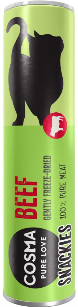 Dobrá zpráva: oblíbené pamlsky Cosma Snackies přicházejí v novém designu! Ve fázi přechodu na nové balení může Vaše objednávka obsahovat produkty v původním i v novém designu. Cosma Snackies: 100 % pravé maso a ryby Přírodní snack pro kočky, z pravého masa a ryb, Vaše kočka si jej zamiluje! Cosma Snackies se připravuje v šetrném procesu mražení a sušení tak, aby si maso zachovalo důležité výživné látky a chuť, což ocení zejména Vaši čtyřnozí miláčci. Při procesu se za působení tepla po dlouhou dobu z masa odpaří voda a díky tomu si maso uchová plnou a intenzivní chuť. Vaše kočka si tuto kvalitu zamiluje, neboť Cosma Snackies se vyrábí z masa, které je normálně určeno pro člověka. Pečlivě vybrané suroviny nabízí Vašemu fajnšmekrovi jen to nejlepší. Cosma Snackies jsou jako stvořené pro mlsný jazýček Vašeho čtyřnohého miláčka: kuře 26 g: lahodné kousky masa pro milovníky kuřecího kachna 21 g: lahodné kachní maso s jedinečnou chutí, čerstvé s výraznou chutí hovězí 23 g: vybrané kousky hovězího, neodolatelné tuňák 25 g: jemné kousky tuňáka, pro milovníky ryb losos 21 g: lahodné kousky lososa, neodolatelná chuť Sušený snack z pravého masa a ryb mají v oblibě hlavně veterináři a chovatelé koček, protože svým kočkám dávají zdravou potravu díky přírodním surovinám. Jejich kočky snack milují! Výjimečné Cosma Snackies jsou uloženy v uzavíratelné tubě, díky které jim zůstane přirozeně čerstvá chuť a vůně. Cosma Snackies se můžou podávat víckrát denně jako svačina nebo přidávat do hlavního krmiva. Vaše kočka si zamiluje jejich přirozenou chuť! Díky Cosma Snackies dáte Vašemu mazlíčkovi jedinečný zážitek, na který jen tak nezapomene. Nové maxi balení Maxi Tubes jsou dostupné v následujících lahodných variacích: Mix s 5 druhy 150 g: 5 delikátních variant v jedné tubě: kuřecí prsa, filet z tuňáka, filet z lososa, hovězí maso a kachní prsa Kuře 160 g: chutná kuřecí prsa pro kočičí milovníky drůbeže Tuňák 150 g: jemné kousky filetu z tuňáka, pro všechny milovníky ryb Kachna 130 g: lahodná kachní prsa s čistou masovou chutí, čerstvé a neodolatelné Extra velké kousky nabízí mimořádně dlouhý chuťový zážitek a jsou ideální také pro větší rasy. Cosma Snackies XXL - mražením sušené snacky můžete objednat v následujících druzích: kuře 30 g: lahodné kousky masa pro milovníky drůbežího masa tuňák 25 g: jemné kousky tuňáka pro milovníky ryb losos 22 g: chutné kousky lososa pro milovníky ryb bílá ryba 18 g: lahodné kousky bílého masa pro kočičí gurmány Cosma Snackies DUO nabízejí nejen čistou a přírodní chuť, ale navíc také dvojitý požitek. V každém balení totiž naleznete dvě lahodné varianty: 100% jemné kousky masa z kuřecích prsou, kousky masa z tuňáka, kuřecí játra nebo malé krevety. Na Vaší kočku tak čeká dvojnásobné potěšení. Cosma Snackies byly vyrobeny šetrnou metodou lyofilizace, při které nedochází ke znehodnocení živin a přirozené chuti. Z masa a ryb je šetrným způsobem odstraněna voda při zachování intenzivní chuti masa. Vaše kočka si tuto prvotřídní kvalitu ocení, neboť snacky jsou vyrobeny z masa a ryb, které jsou určeny pro lidskou spotřebu. Pečlivě vybrané suroviny nabízejí Vašemu čtyřnohému gurmánovi jen to nejlepší. Dostupné jsou v následujících variantách: Kuřecí prsa a krevety 23 g: 75 % kuřecí prsa, 25 % krevety - pro všechny labužníky Kuřecí prsa a filet z tuňáka 26 g: 75 % kuřecí prsa, 25 % filet z tuňáka - pro malé milovníky masa Kuřecí prsa a kuřecí játra 28 g: 75 % kuřecí prsa, 25 % kuřecí játra - pro milovníky drůbeže Extra malé kousky Cosma Minis jsou ideální jako pamlsky pro koťata, dospělé a starší kočky nebo k vylepšení mokrého a suchého krmiva. Vyberte si z následujících oblíbených druhů: Kuřecí 26 g: jemná kuřecí prsa Tuňák 25 g: lahodný filet z tuňáka Losos 21 g: vybraný filet z lososa Cosma Snackies Minis v přehledu: Bez obilnin 100% filet Extra malé kousky, ideální také pro koťata a pro kočičí seniory Ideální k vylepšení mokrého a suchého krmiva Bez přísad Nyní v praktické tubě pro extra dlouhotrvající požitek Kočky milují Cosma Snackies! Využijte naší nabídky! Pouze po krátkou dobu můžete vyzkoušet vybrané balení Cosma snacků za jedinečnou zkušební cenu! Upozornění: tato nabídka se vztahuje pouze na položku s číslem 1248916.
