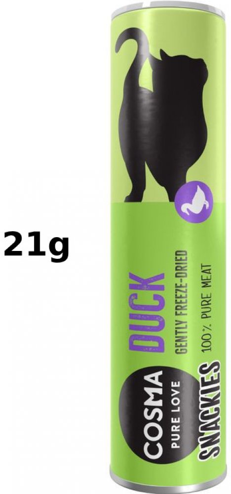 Dobrá zpráva: oblíbené pamlsky Cosma Snackies přicházejí v novém designu! Ve fázi přechodu na nové balení může Vaše objednávka obsahovat produkty v původním i v novém designu. Cosma Snackies: 100 % pravé maso a ryby Přírodní snack pro kočky, z pravého masa a ryb, Vaše kočka si jej zamiluje! Cosma Snackies se připravuje v šetrném procesu mražení a sušení tak, aby si maso zachovalo důležité výživné látky a chuť, což ocení zejména Vaši čtyřnozí miláčci. Při procesu se za působení tepla po dlouhou dobu z masa odpaří voda a díky tomu si maso uchová plnou a intenzivní chuť. Vaše kočka si tuto kvalitu zamiluje, neboť Cosma Snackies se vyrábí z masa, které je normálně určeno pro člověka. Pečlivě vybrané suroviny nabízí Vašemu fajnšmekrovi jen to nejlepší. Cosma Snackies jsou jako stvořené pro mlsný jazýček Vašeho čtyřnohého miláčka: kuře 26 g: lahodné kousky masa pro milovníky kuřecího kachna 21 g: lahodné kachní maso s jedinečnou chutí, čerstvé s výraznou chutí hovězí 23 g: vybrané kousky hovězího, neodolatelné tuňák 25 g: jemné kousky tuňáka, pro milovníky ryb losos 21 g: lahodné kousky lososa, neodolatelná chuť Sušený snack z pravého masa a ryb mají v oblibě hlavně veterináři a chovatelé koček, protože svým kočkám dávají zdravou potravu díky přírodním surovinám. Jejich kočky snack milují! Výjimečné Cosma Snackies jsou uloženy v uzavíratelné tubě, díky které jim zůstane přirozeně čerstvá chuť a vůně. Cosma Snackies se můžou podávat víckrát denně jako svačina nebo přidávat do hlavního krmiva. Vaše kočka si zamiluje jejich přirozenou chuť! Díky Cosma Snackies dáte Vašemu mazlíčkovi jedinečný zážitek, na který jen tak nezapomene. Nové maxi balení Maxi Tubes jsou dostupné v následujících lahodných variacích: Mix s 5 druhy 150 g: 5 delikátních variant v jedné tubě: kuřecí prsa, filet z tuňáka, filet z lososa, hovězí maso a kachní prsa Kuře 160 g: chutná kuřecí prsa pro kočičí milovníky drůbeže Tuňák 150 g: jemné kousky filetu z tuňáka, pro všechny milovníky ryb Kachna 130 g: lahodná kachní prsa s čistou masovou chutí, čerstvé a neodolatelné Extra velké kousky nabízí mimořádně dlouhý chuťový zážitek a jsou ideální také pro větší rasy. Cosma Snackies XXL - mražením sušené snacky můžete objednat v následujících druzích: kuře 30 g: lahodné kousky masa pro milovníky drůbežího masa tuňák 25 g: jemné kousky tuňáka pro milovníky ryb losos 22 g: chutné kousky lososa pro milovníky ryb bílá ryba 18 g: lahodné kousky bílého masa pro kočičí gurmány Cosma Snackies DUO nabízejí nejen čistou a přírodní chuť, ale navíc také dvojitý požitek. V každém balení totiž naleznete dvě lahodné varianty: 100% jemné kousky masa z kuřecích prsou, kousky masa z tuňáka, kuřecí játra nebo malé krevety. Na Vaší kočku tak čeká dvojnásobné potěšení. Cosma Snackies byly vyrobeny šetrnou metodou lyofilizace, při které nedochází ke znehodnocení živin a přirozené chuti. Z masa a ryb je šetrným způsobem odstraněna voda při zachování intenzivní chuti masa. Vaše kočka si tuto prvotřídní kvalitu ocení, neboť snacky jsou vyrobeny z masa a ryb, které jsou určeny pro lidskou spotřebu. Pečlivě vybrané suroviny nabízejí Vašemu čtyřnohému gurmánovi jen to nejlepší. Dostupné jsou v následujících variantách: Kuřecí prsa a krevety 23 g: 75 % kuřecí prsa, 25 % krevety - pro všechny labužníky Kuřecí prsa a filet z tuňáka 26 g: 75 % kuřecí prsa, 25 % filet z tuňáka - pro malé milovníky masa Kuřecí prsa a kuřecí játra 28 g: 75 % kuřecí prsa, 25 % kuřecí játra - pro milovníky drůbeže Extra malé kousky Cosma Minis jsou ideální jako pamlsky pro koťata, dospělé a starší kočky nebo k vylepšení mokrého a suchého krmiva. Vyberte si z následujících oblíbených druhů: Kuřecí 26 g: jemná kuřecí prsa Tuňák 25 g: lahodný filet z tuňáka Losos 21 g: vybraný filet z lososa Cosma Snackies Minis v přehledu: Bez obilnin 100% filet Extra malé kousky, ideální také pro koťata a pro kočičí seniory Ideální k vylepšení mokrého a suchého krmiva Bez přísad Nyní v praktické tubě pro extra dlouhotrvající požitek Kočky milují Cosma Snackies! Využijte naší nabídky! Pouze po krátkou dobu můžete vyzkoušet vybrané balení Cosma snacků za jedinečnou zkušební cenu! Upozornění: tato nabídka se vztahuje pouze na položku s číslem 1248916.
