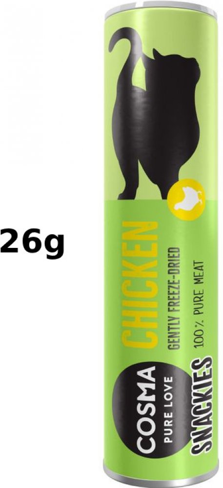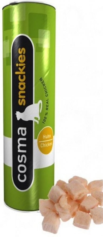 Dobrá zpráva: oblíbené pamlsky Cosma Snackies přicházejí v novém designu! Ve fázi přechodu na nové balení může Vaše objednávka obsahovat produkty v původním i v novém designu. Cosma Snackies: 100 % pravé maso a ryby Přírodní snack pro kočky, z pravého masa a ryb, Vaše kočka si jej zamiluje! Cosma Snackies se připravuje v šetrném procesu mražení a sušení tak, aby si maso zachovalo důležité výživné látky a chuť, což ocení zejména Vaši čtyřnozí miláčci. Při procesu se za působení tepla po dlouhou dobu z masa odpaří voda a díky tomu si maso uchová plnou a intenzivní chuť. Vaše kočka si tuto kvalitu zamiluje, neboť Cosma Snackies se vyrábí z masa, které je normálně určeno pro člověka. Pečlivě vybrané suroviny nabízí Vašemu fajnšmekrovi jen to nejlepší. Cosma Snackies jsou jako stvořené pro mlsný jazýček Vašeho čtyřnohého miláčka: kuře 26 g: lahodné kousky masa pro milovníky kuřecího kachna 21 g: lahodné kachní maso s jedinečnou chutí, čerstvé s výraznou chutí hovězí 23 g: vybrané kousky hovězího, neodolatelné tuňák 25 g: jemné kousky tuňáka, pro milovníky ryb losos 21 g: lahodné kousky lososa, neodolatelná chuť Sušený snack z pravého masa a ryb mají v oblibě hlavně veterináři a chovatelé koček, protože svým kočkám dávají zdravou potravu díky přírodním surovinám. Jejich kočky snack milují! Výjimečné Cosma Snackies jsou uloženy v uzavíratelné tubě, díky které jim zůstane přirozeně čerstvá chuť a vůně. Cosma Snackies se můžou podávat víckrát denně jako svačina nebo přidávat do hlavního krmiva. Vaše kočka si zamiluje jejich přirozenou chuť! Díky Cosma Snackies dáte Vašemu mazlíčkovi jedinečný zážitek, na který jen tak nezapomene. Nové maxi balení Maxi Tubes jsou dostupné v následujících lahodných variacích: Mix s 5 druhy 150 g: 5 delikátních variant v jedné tubě: kuřecí prsa, filet z tuňáka, filet z lososa, hovězí maso a kachní prsa Kuře 160 g: chutná kuřecí prsa pro kočičí milovníky drůbeže Tuňák 150 g: jemné kousky filetu z tuňáka, pro všechny milovníky ryb Kachna 130 g: lahodná kachní prsa s čistou masovou chutí, čerstvé a neodolatelné Extra velké kousky nabízí mimořádně dlouhý chuťový zážitek a jsou ideální také pro větší rasy. Cosma Snackies XXL - mražením sušené snacky můžete objednat v následujících druzích: kuře 30 g: lahodné kousky masa pro milovníky drůbežího masa tuňák 25 g: jemné kousky tuňáka pro milovníky ryb losos 22 g: chutné kousky lososa pro milovníky ryb bílá ryba 18 g: lahodné kousky bílého masa pro kočičí gurmány Cosma Snackies DUO nabízejí nejen čistou a přírodní chuť, ale navíc také dvojitý požitek. V každém balení totiž naleznete dvě lahodné varianty: 100% jemné kousky masa z kuřecích prsou, kousky masa z tuňáka, kuřecí játra nebo malé krevety. Na Vaší kočku tak čeká dvojnásobné potěšení. Cosma Snackies byly vyrobeny šetrnou metodou lyofilizace, při které nedochází ke znehodnocení živin a přirozené chuti. Z masa a ryb je šetrným způsobem odstraněna voda při zachování intenzivní chuti masa. Vaše kočka si tuto prvotřídní kvalitu ocení, neboť snacky jsou vyrobeny z masa a ryb, které jsou určeny pro lidskou spotřebu. Pečlivě vybrané suroviny nabízejí Vašemu čtyřnohému gurmánovi jen to nejlepší. Dostupné jsou v následujících variantách: Kuřecí prsa a krevety 23 g: 75 % kuřecí prsa, 25 % krevety - pro všechny labužníky Kuřecí prsa a filet z tuňáka 26 g: 75 % kuřecí prsa, 25 % filet z tuňáka - pro malé milovníky masa Kuřecí prsa a kuřecí játra 28 g: 75 % kuřecí prsa, 25 % kuřecí játra - pro milovníky drůbeže Extra malé kousky Cosma Minis jsou ideální jako pamlsky pro koťata, dospělé a starší kočky nebo k vylepšení mokrého a suchého krmiva. Vyberte si z následujících oblíbených druhů: Kuřecí 26 g: jemná kuřecí prsa Tuňák 25 g: lahodný filet z tuňáka Losos 21 g: vybraný filet z lososa Cosma Snackies Minis v přehledu: Bez obilnin 100% filet Extra malé kousky, ideální také pro koťata a pro kočičí seniory Ideální k vylepšení mokrého a suchého krmiva Bez přísad Nyní v praktické tubě pro extra dlouhotrvající požitek Kočky milují Cosma Snackies! Využijte naší nabídky! Pouze po krátkou dobu můžete vyzkoušet vybrané balení Cosma snacků za jedinečnou zkušební cenu! Upozornění: tato nabídka se vztahuje pouze na položku s číslem 1248916.