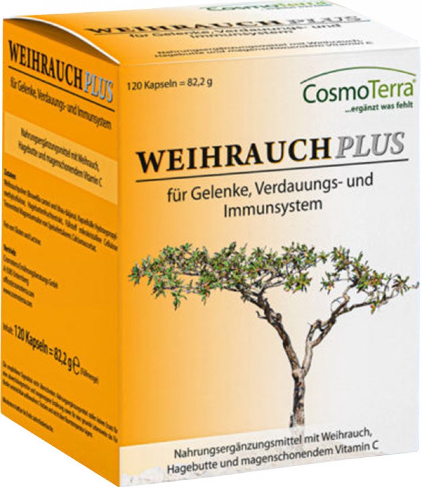 Kapsle COSMOTERRA WEIHRAUCH PLUS vyvinuli odborníci na výživu. Obsahují éterické oleje, antioxidanty flavonoidy i kyseliny boswellové pocházející z rodu kadidlovníku Boswellia carteri a Boswellia bhau-daijana a pufrovaný vitamin C šetrný k žaludku.