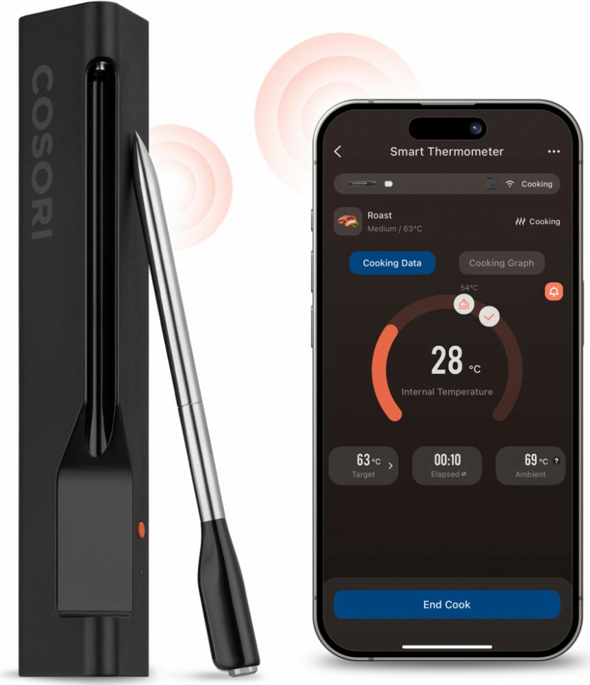 Digitální kuchyňský teploměr Cosori bude praktickou pomůckou do domácnosti. Je vhodný pro použití při vaření, pečení či uzení, abyste měli možnost při přípravě kontrolovat teplotu vaší oblíbené paštiky či dezertu. Vybavený je jednou teplotní sondou s délkou 129 mm, pomocí které budete moci měřit teplotu pokrmů. Teploměr je upravený pro teploty v rozsahu od 0 do 300 °C. Je konstruován s odolností vůči vysokým teplotám, což ho činí ideální volbou při grilování. Se smart funkcí lze teploměr propojit s mobilní aplikací a vybrat si přednastavené režimy. Výhodu přináší také magnet, díky kterému teploměr bez problému přichytíte třeba na lednici. Vybaven je praktickým držák pro jednoduché a bezpečné uchycení kuchyňského teploměru. S kuchyňským teploměrem dostanete také nabíjecí stojánek. Nabízený kuchyňský teploměr Cosori napájí 1× AAA baterie, která je součástí balení. Klíčové přednosti produktu Cosori Smart kuchyňský teploměr se sondou Digitální kuchyňský teploměr Cosori si v kuchyni určitě oblíbíte Využití...