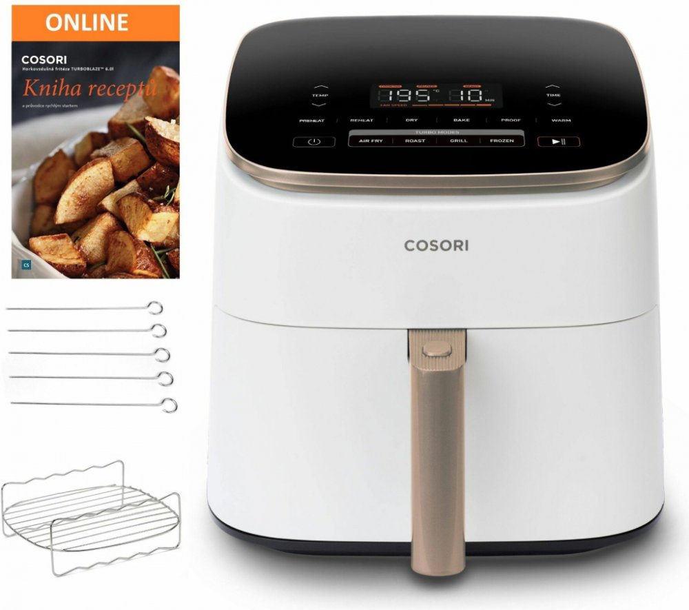 Horkovzdušná fritéza Cosori TurboBlaze Pro 6,2LPochutnejte si na zdravých pokrmech a ušetřete svůj drahocenný čas s horkovzdušnou fritézou Cosori TurboBlaze Pro. Řízky, hranolky nebo cibulové kroužky připravíte v nádobě s nepřilnavým povrchem, která má objem 6,2 l. Čištění fritézy Cosori TurboBlaze pro vás bude snadné. Teplotu lze nastavit v rozmezí 30 do 230 °C. Příkon 1725 W zařídí rychlé zahřát...