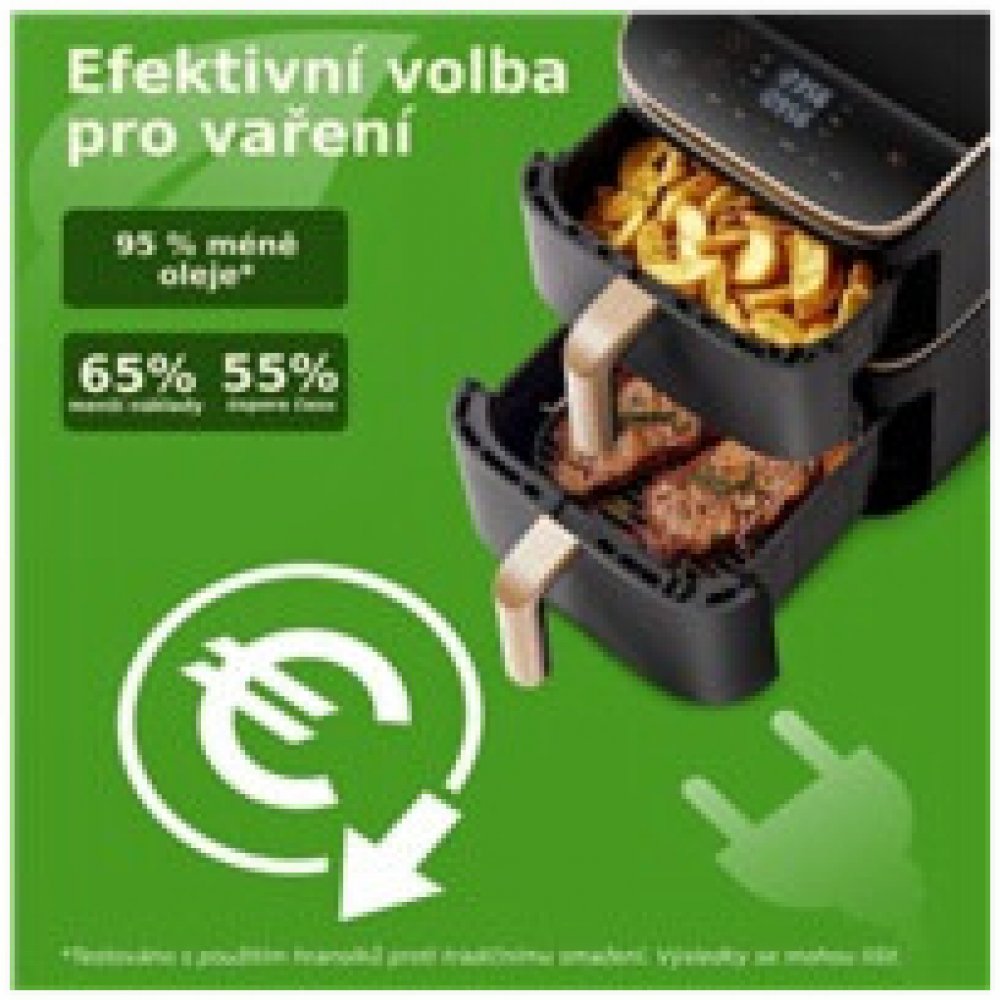 Zdravé vaření nyní získává zcela nový význam. Díky keramickému povrchu košů a až o 95% nižší spotřebě oleje si můžete užít smažená jídla mnohem zdravěji a především chutněji. Integrace chytré aplikace umožňuje ovládat horkovzdušnou fritézu na dálku, což poskytuje přístup k tisícům receptů a průběžnému stavu vaření, což usnadňuje přípravu zdravých a chutných pokrmů. Se sedmi univerzálními funkcemi, včetně fritování, pečení, grilování, sušení nebo kynutí, jde skutečně o multifunkční zařízení, které obohatí vaši kuchyni o neomezené možnosti vaření. Díky Wi-Fi konektivitě můžete fritézu ovládat a sledovat i vzdáleně a s aplikací získáte přístup k receptům a výživovým tipům.