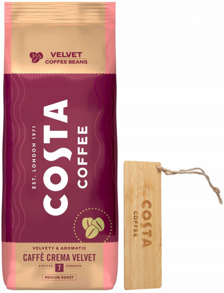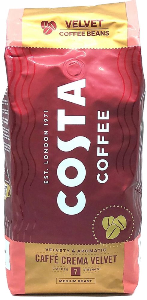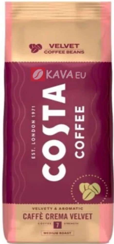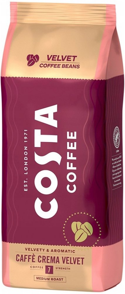 Costa Caffe Caffe Crema VELVET vás okouzlí jemnou a hedvábnou chutí s nevšedním aroma. Je dokonale sladěnou směsí arabiky a robusty s intenzivní vůní s nádechem tmavé čokolády. Kávu Costa Coffee můžeme připravit v automatických, bankovních kávovarech i při správném mletí jejích chuťových vlastností objevíme v moce kávovaru.