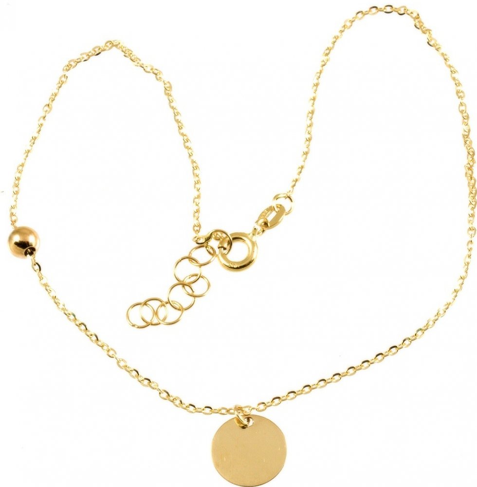 Zlatý dámský náramek na nohu v kombinaci žlutého a bílého 14ti karátového zlata ryzosti 585/1000 o nastavitelné délce 24+2cm, váha 1.42g, zápon SK kroužek. Řetízek je typu anker o šíři 1.1mm, průměr destičky 9mm, zlatá kulička průměr 4mm.