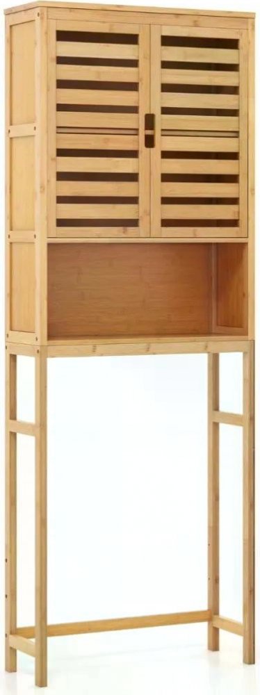 Využijte každý centimetr v koupelně s touto skříňkou nad pračku či toaletu! Tento organizér kombinuje otevřený a skrytý úložný prostor a je navržen jako skříňka a otevřená police. Volný prostor na podlaze je vhodný pro většinu toalet a pro užší pračky. Kromě toho je spodní lišta nastavitelná ve 3 různých výškách. Tato koupelnová skříňka je vyrobena z bambusu a materiálu MDF a je odolná pro dlouhodobé používání. Tento vysoký koupelnový regál je vybaven dvoudveřovou skříňkou a policí a také otevřenou policí, která poskytuje dostatek prostoru pro koupelnové potřeby, jako jsou ručníky, toaletní potřeby, produkty péče o pleť, toaletní papír nebo prací prostředky. Bambusová toaletní skříňka nabízí spolehlivou odolnost a dodá vaší koupelně nádech přírody. Dvířka jsou vybavena magnetickým zavíráním a výřezem na úchytky. Snadno čistitelný povrch lze rychle otřít. Skříňku můžete pro větší bezpečnost připevnit na zeď, což pomůže zabránit nehodám při převrácení a ochrání vaše děti a domácí mazlíčky před zraněním. Potřebné ochranné zařízení proti převrácení je součástí balení. Snadná montáž dle návodu.