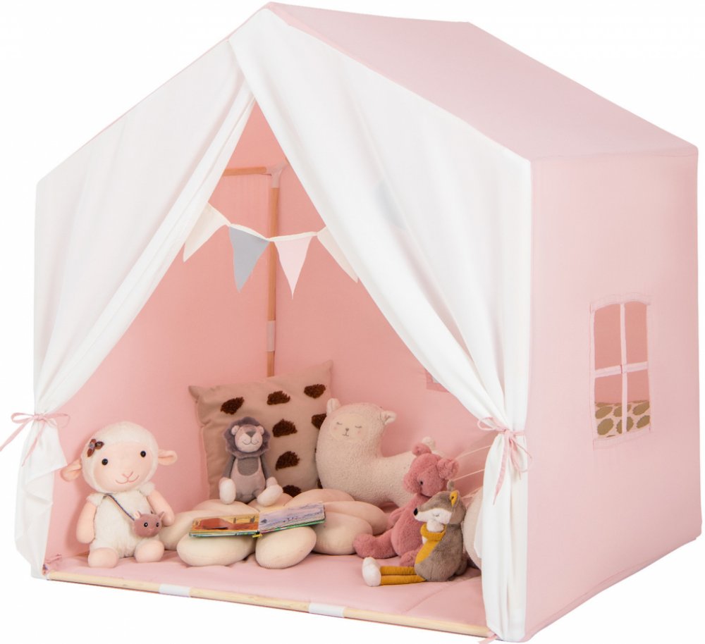 Atributy:Prostorný prostor pro 3 dětiTento hrací stan o rozměrech 131 x 91 x 131 (D x Š x V) poskytuje dostatek prostoru pro hraní 3 dětí nebo 2 dospělých a trávení kvalitního času s přáteli nebo rodiči.Podložka šetrná k pokožcea omyvatelnáNaše hrací stany jsou dodávány s měkkou hrací podložkou. Podložka je odnímatelná a lze ji prát v pračce. Protiskluzová spodní strana navíc zvyšuje bezpečnost.Vhodná prodětské postýlkyDětský hrací stan je vhodný nejen pro postele a matrace do maximální délky 128 cm, ale také pro postele, které jsou větší než stan a lze je umístit na postel.Bezpečnýmateriál a stabilní rámHrací domeček je vyroben z vysoce kvalitní tkaniny pro dlouhodobé používání. Pevný dřevěný rám s trojúhelníkovými zesílenými spoji zajišťuje, že je stabilní a snadno se nezhroutí.AtraktivnídesignJe vybaven dvěma stíněnými okny a záclonkami, takže dětem poskytuje tajný koutek a zároveň zajišťuje dobré větrání. Barevné praporky s vlajkami dělají stan ještě zábavnějším!Popis: Stan je vyroben z kvalitního materiálu, který je součástí balení:Náš velký hrací stan pojme až 3 děti nebo 2 dospělé. Vejde se do něj také jedno dítě a jeden dospělý najednou, takže je ideálním místem pro čtení rodičů s dětmi. Prodyšná okna zajišťují vynikající větrání a viditelnost. Gázové závěsy se stuhami a praporky přitahují pozornost dětí. Hrací podložka šetrná k pokožce je polstrovaná měkkou bavlnou, takže se vaše děťátko nebude cítit nepohodlně, a lze ji prát v pračce. Díky vybranému masivnímu dřevu a látce je navíc dostatečně odolná, aby mohla vaše děťátko provázet po dlouhou dobu. Celkové rozměry tohoto stanu jsou 131 x 91 x 131 (D x Š x V).Součástí balení je: - dětská postýlka pro děti, která je vhodná pro děti od 3 let:Velkorysý prostor na čtení a hraní pojme až 3 děti nebo 2 dospělé osobyKrásný stan na spaní vhodný pro dětské postýlky s maximální šířkou 1,28 mNabízí prostor pro matraci do dětské postýlky nebo matraci pro dvě osobyPolstrovaná podložka s protiskluzovou spodní stranou pro pohodlné a bezpečné používáníTkanina, kterou lze prát v pračce pro snadné čištěníVyrobeno z odolného a pevného rámu z masivního dřeva a trojúhelníkové konstrukce na horní straněVhodná pro vnitřní i venkovní použití (herna, ložnice, trávník nebo dvorek)Lehký materiál a snadný pohyb šetří čas a energiiVyznačuje se jedinečným a atraktivním vzhledem s praporkem a gázovým závěsemSnadná montáž, demontáž a čištěníTechnical data:Barva: růžováMateriál: borovicové dřevo + polyesterová bavlněná tkaninaCelkové rozměry: 131 cm x 91 cm x 131 cm (d x š x v)Použitelná šířka postýlky: 1,28 mDoporučený věk: od 3 letČistá hmotnost: 3,5 kgRozsah dodávky:součástí balení je: 1 x hrací stan1 x vlajkový transparent1 x bavlněná podložka1 x návod