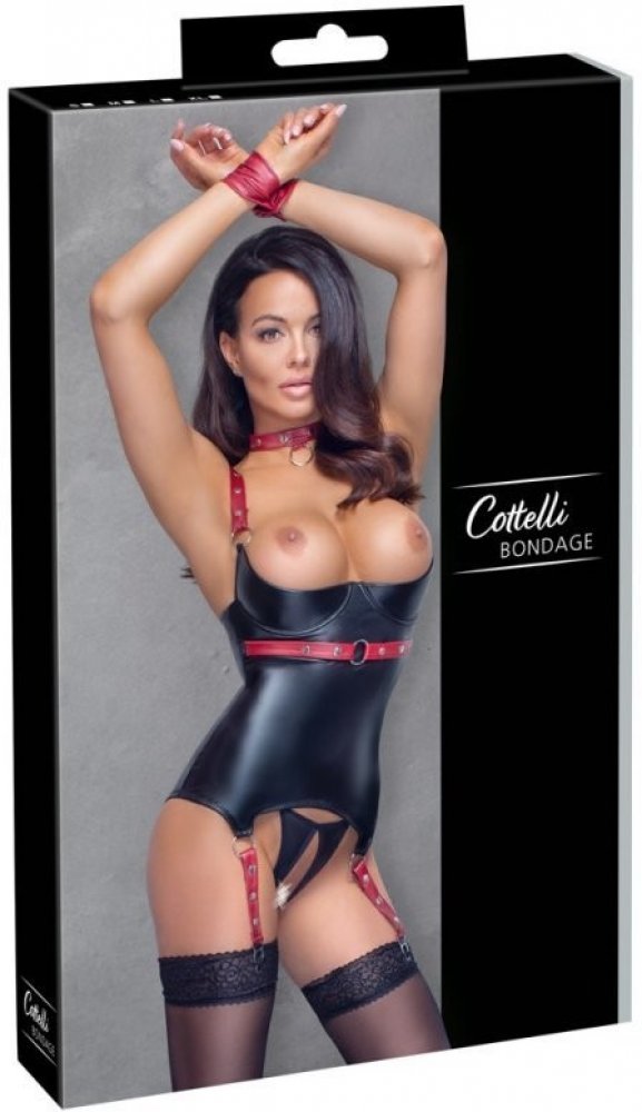 Exciting crotchless set with a collar and handcuffs! Revealing basque and crotchless string made out of beautiful, stretchy matte look material with bra straps, suspender straps and a waist strap (only at the front) in red material with studs. The basque has underwired shelf bra cups and a hook fastener at the back. The bra and suspender straps can be adjusted for a perfect fit. The string is crotchless. The included collar and handcuffs are in a matching red colour. The collar has a ring at the front can be adjusted with the press studs. The simple handcuffs can be worn stylishly on the wrists so that the hands are tied at the front or the back of the body. 90% polyester, 10% spandex; collar and restraints 85% polyester, 15% spandex.