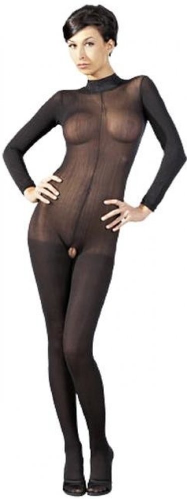 Catsuit černý jako noc zahaluje celé tělo a zároveň vše odkrývá díky průhlednému silonkovému materiálu. Ani panter nepůsobí tak ladně jako tělíčko oblečené do této super přiléhavé kombinézy s krajkovým lemem u krku. V rozkroku průstřih.