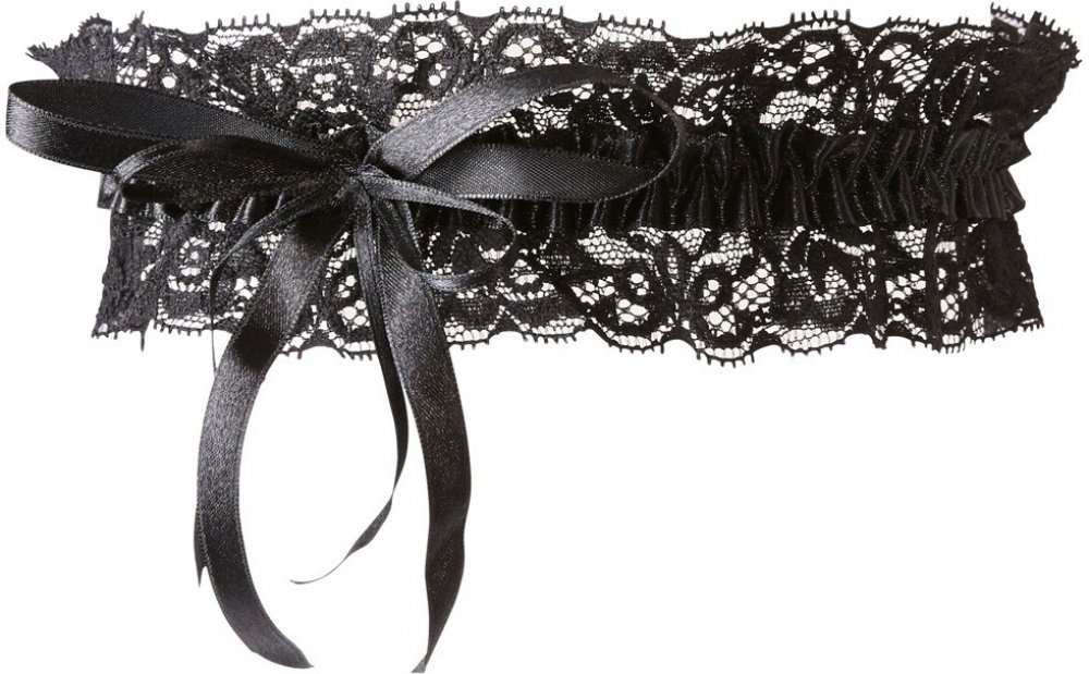 Černý krásně zdobený krajkový podvazek se saténovou stuhou.