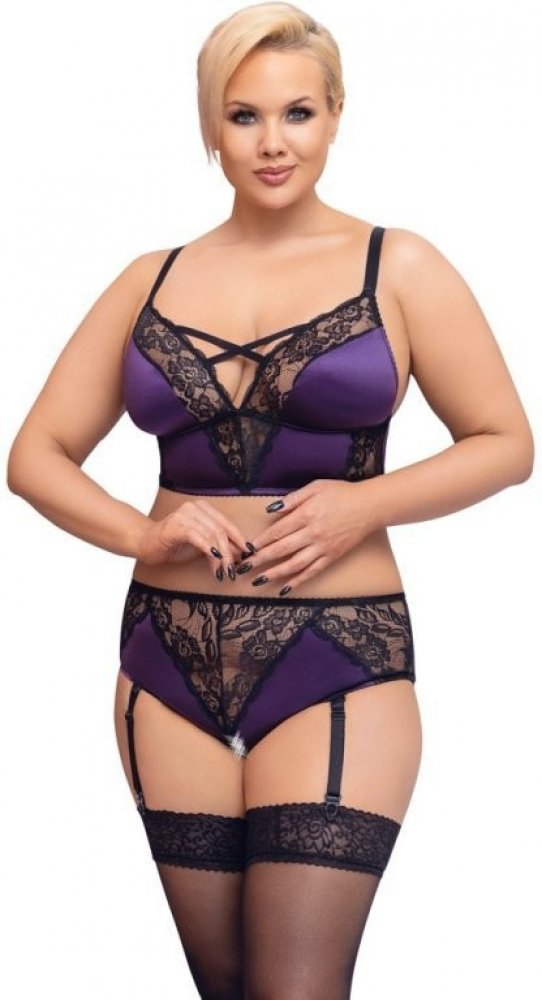 Vyzývavý set pro baculkySvůdná souprava od značky Cottelli Collection ze saténu a krajky ve fialové barvě. Podprsenkový top nemá klasické podprsenkové zapínání na zádech a je bez kostic. Má překřížené gumičky přes dekolt a nastavitelná pružná ramínka. Kalhotky s vysokým pasem mají otevřený rozkrok a podvazkové pásky lze nastavit nebo úplně sundat. Inspirujte se sexy prádlem pro baculky v kategorii...