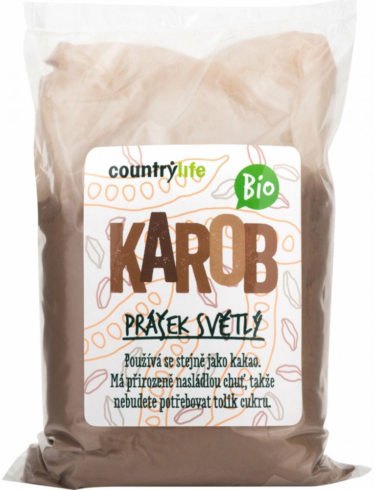 Country Life Karobový prášek světlý BIO 500 g. Díky jemné konzistenci nevyžaduje ani přidávání velkého množství tuku (při výrobě čokolády běžné). Pochází ze stromu, který roste hlavně na Středním východě, kde se pěstuje už nejméně 4 000 let. Karob obsahuje 8% bílkovin, velký díl přirozeného cukru (asi 46%), vitamíny skupiny B, minerály - vápník, hořčík, draslík, a stopové prvky - železo, mangan, chrom, měď. Porovnáme-li jej s kakaem, má třikrát vyšší obsah vápníku, o třetinu méně kalorií a sedmnáctkrát méně tuku! Karob je bohatým zdrojem vlákniny pektinu. Složení: Karobový prášek světlý*. *produkt kontrolovaného ekologického zemědělství Návod k přípravě: V receptech používejte místo kakaa a čokolády. Skladování: Skladujte při teplotě do 25°C a relativní vlhkosti vzduchu do 70%.