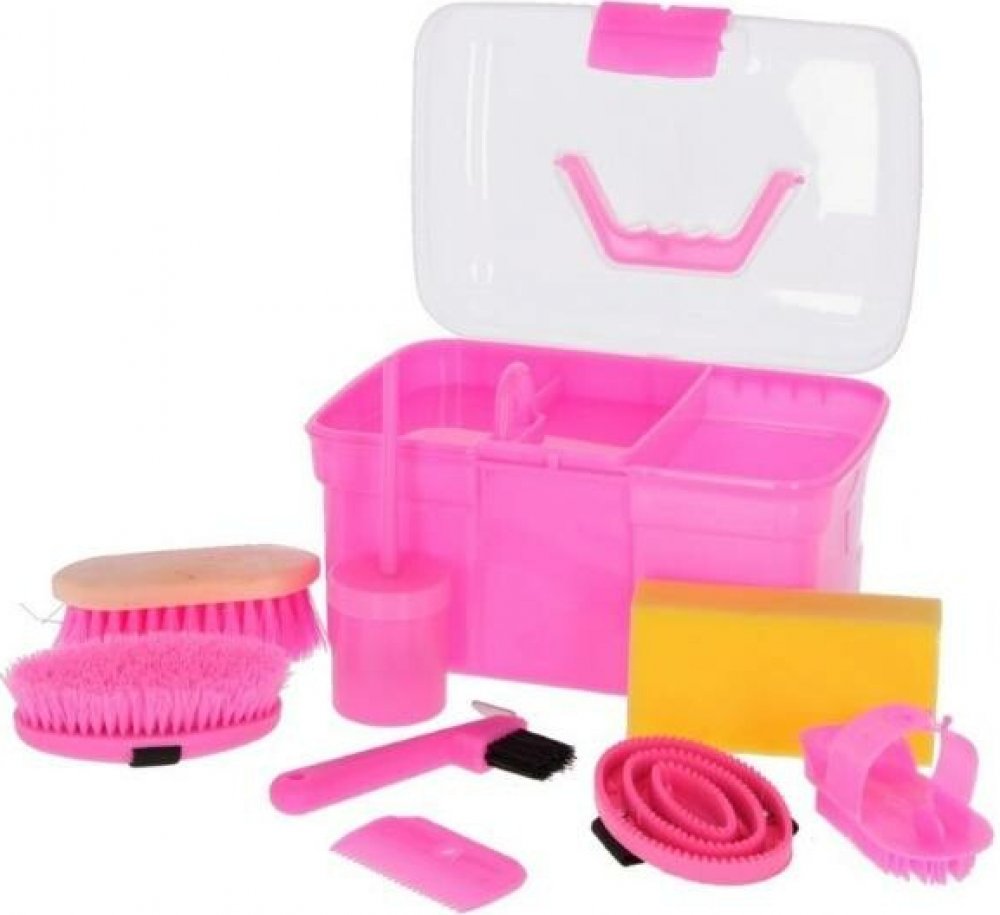 součástí je houba, háček na kopyta, štěteček na mazání na kopyta, plastové hřbílko, gumové hřbílko, rýžový kartáč, kartáč na tělo a hřebínek na hřívu