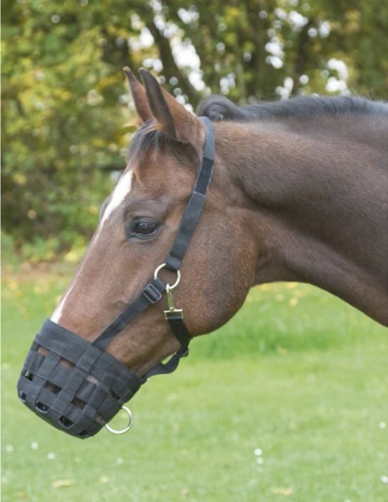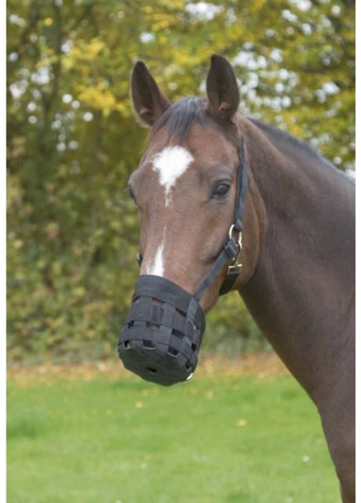 Pastevní náhubek vhodný například pro koně s predispozicí ke schvácení nebo pro koně, kteří žerou příliš zbrkle. Snadno se připevňuje, s výztuhou v oblasti huby.