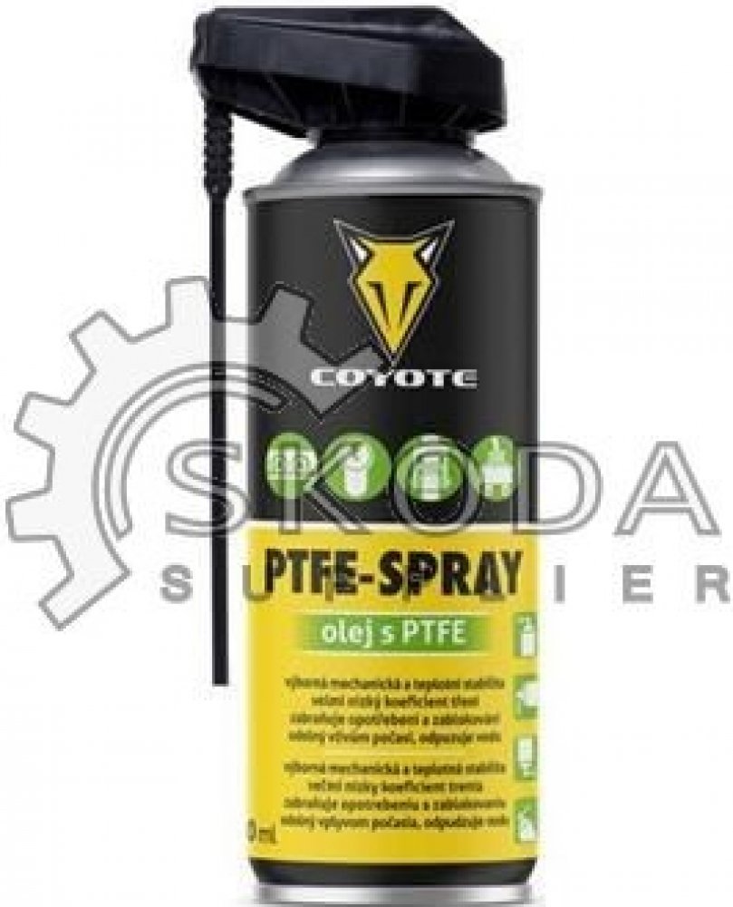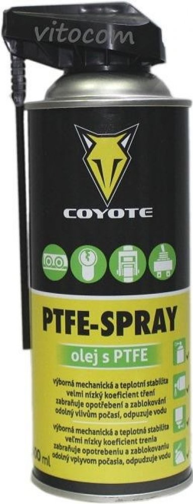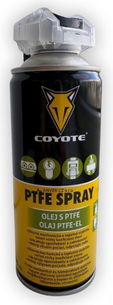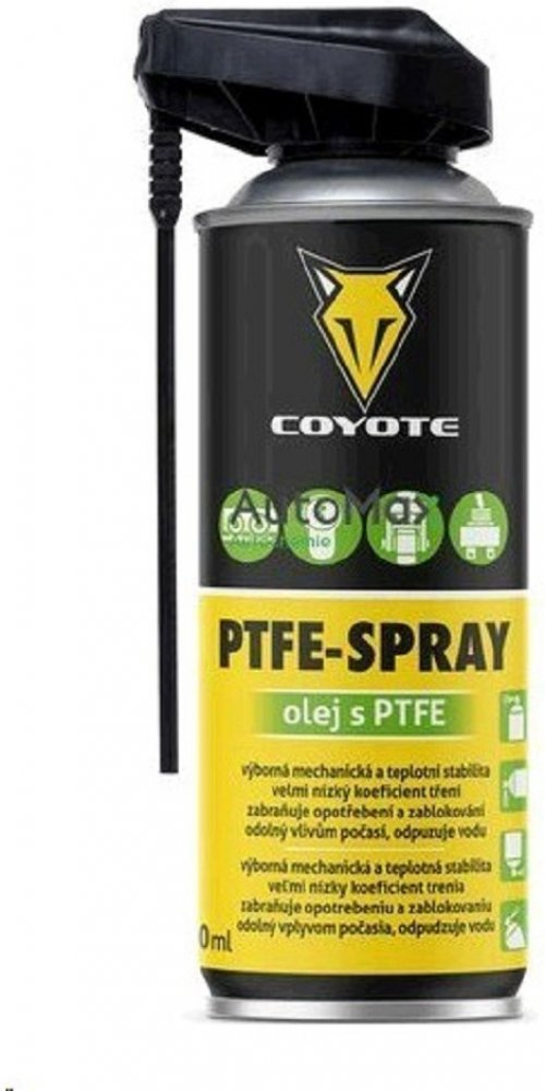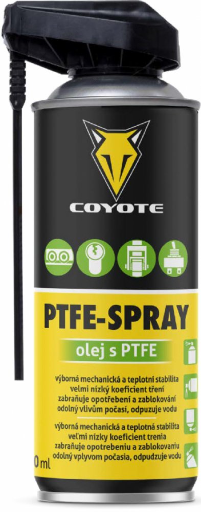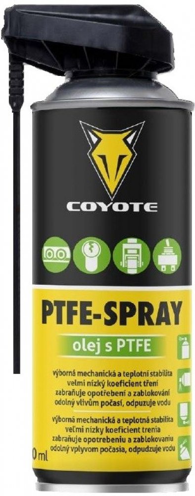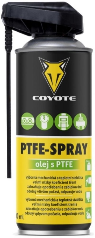 COYOTE PTFE-Spray je spolehlivé a vysoce kvalitní mazivo s PTFE, které dokonale ošetří kovové i plastové části. Ideální pro řetězy, převodová kola, kolejnice, dveřní panty, zasouvací dveře a mnoho dalších mechanismů. Jeho vynikající vlastnosti zahrnují velmi nízký koeficient tření, skvělou přilnavost a schopnost zabránit opotřebení či zab...