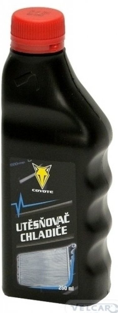 COYOTE UTĚSŇOVAČ CHLADIČE TEKUTÝ je kvalitní směs, která utěsňuje drobné netěsnosti chladiče, chladícího a topného systému. Zabraňuje úbytkům chladicí kapaliny. Neucpává průchodky a ventily v chladicím systému. NÁVOD K POUŽITÍ: Nechte krátce běžet motor, dokud se voda neohřeje. Při sundávaní uzávěru chladicího systému dbejte zvýšené opatrnosti a dávejte pozor na tlak v chladicím systému. Zkontrolujte, zda je otvorem vidět hladina chladicí kapaliny. Láhev důkladně protřepejte min. 2 minuty a nalijte celý objem nádoby do chladiče. Několik minut nechejte motor běžet, aby mohl přípravek ztvrdnout. Jedna nádoba vystačí až na 12 litrů chladicí kapaliny.
