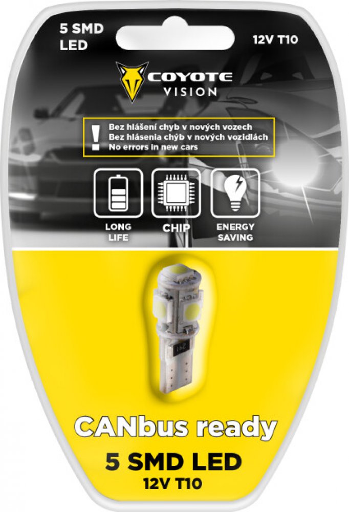 COYOTEŽárovka 12V LED 5 SMD T10 CAN BUS VISIONZnačková LED autožárovka je vybavena funkcí CAN BUS ready. Homologováno pro běžný provoz na komunikacích.COYOTE - Žárovka 12V LED 5 SMD T10 CAN-BUS VISION - Značková LED autožárovka je vybavena funkcí CAN-BUS ready. Homologováno pro běžný provoz na komunikacích.