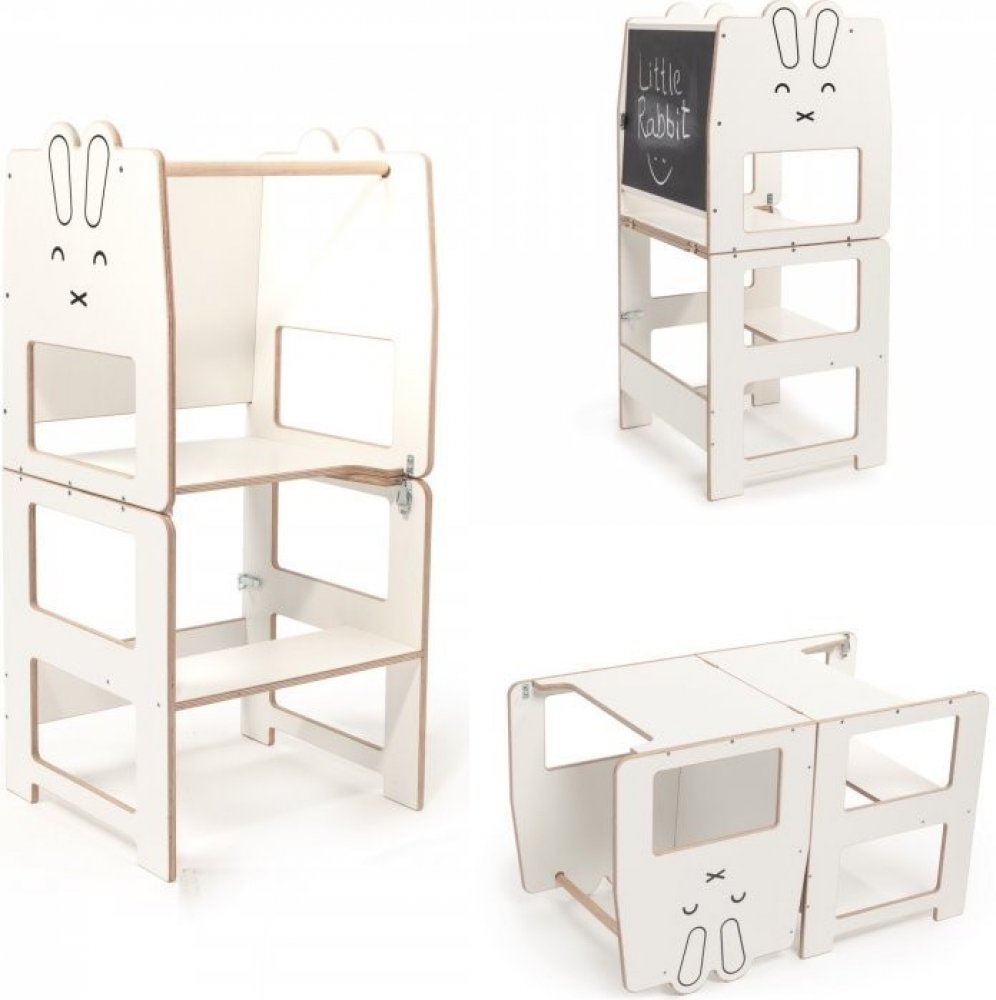 Učící věž Craffox je víceúčelová. Slouží nejen jako kuchyňská učící věž, ale snadnou přestavbou se z věže stane stůl se židlí pro jedno nebo dvě děti. Na zadní straně věže je křídová tabule, na které mohou děti rozvíjet svoje výtvarné umění. Přestavba věže je jednoduchá. Stačí odklopit boční spony a jednou rukou sklopit horní část. Rázem se z učící věže Craffox stane stůl, který mohou využívat i dvě děti současně. Učící věž Craffox je zcela ideální do malých bytů, kde bude plnit několik funkcí najednou a nemusíte tak kupovat učící věž, dětský stůl, židli, případně tabuli zvlášť. Spony slouží k upevnění věže v obou polohách. Přestavovat věž z jedné pozice do druhé mohou pouze rodiče. Učící věž nevyužijete pouze v kuchyni, ale i při dalších činnostech jako je čištění zubů, mytí rukou, pomáhání tatínkovi v dílně nebo při podávání hraček, které jsou v horních policích. Věž je opatřena speciálními ochrannými bočnicemi, které chrání dítě před nechtěným pádem. Dítko, které už umí lézt po čtyřech a stát bez problému dokáže do věže samo nalézt i slézt. Učící věž Craffox váží přibližně 8 kg a dítě ji proto bez problému samo dotlačí kam zrovna potřebuje.