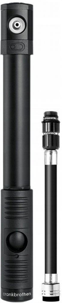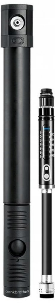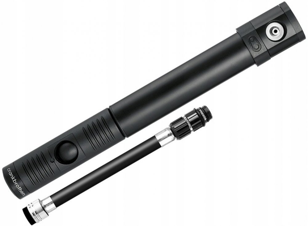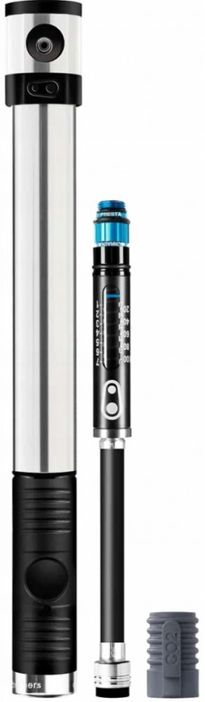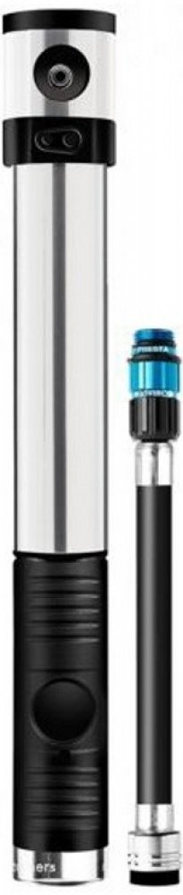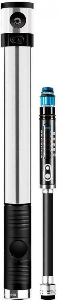 Luxusní minipumpička se skládací rukojetí, skrytou hadičkou uvnitř těla a patentovanou magnetickou hlavicí je připravena na oba typy ventilů. Vybavena je dále manometrem a adaptérem na CO2. Držák na rám je součástí balení.