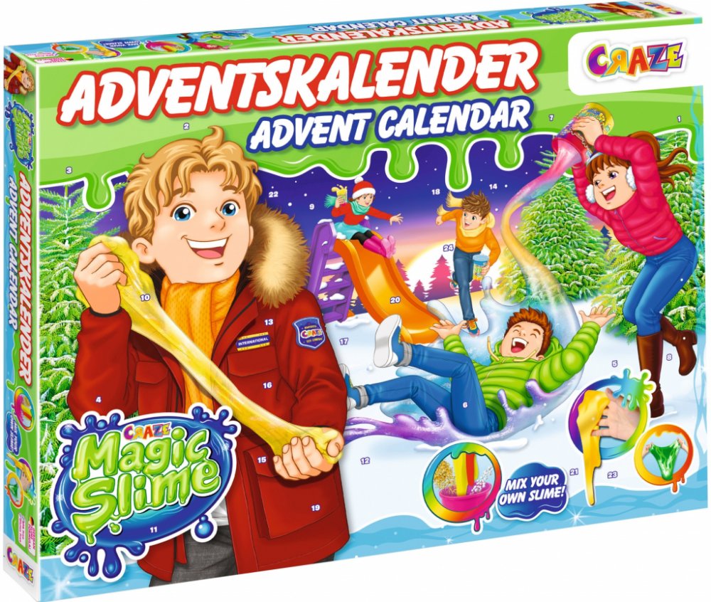 Bezpečná a kvalitní německá receptura zaručuje, že sliz je netoxický, neobsahuje BPA a je šetrný k dětské pokožce. Na zadní straně kalendáře navíc děti najdou zábavnou „slizí“ deskovou hru, kterou si mohou zahrát s kamarády!