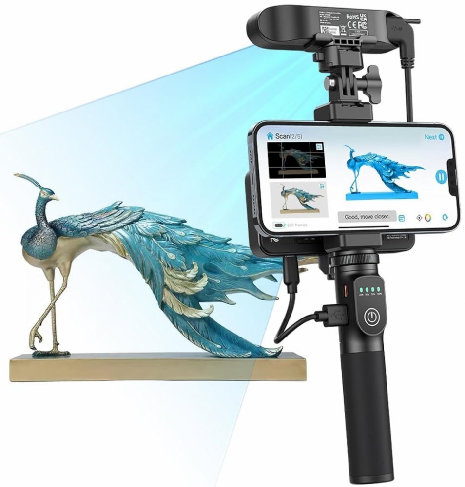 Mini 3D skener: Snadno se drží jednou rukou; váží pouhých 105 g, což odpovídá hmotnosti pomeranče; snadno se vejde do kapsy nebo batohu. Stačí kdykoli a kdekoli popustit uzdu své inspiraci.