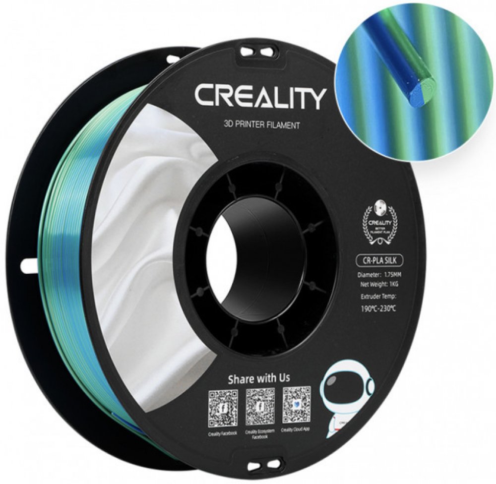 Creality CR-Silk PLA vlákno (modro-zelené) Vlákno Creality CR-Silk má kovový, elegantní lesk, díky čemuž je poutavé a ideální pro tisk figurek, dekorací a dokonce i šperků. Vyznačuje se také působivou odolností a kompatibilitou s většinou tiskáren Creality. A co víc, na jeho výrobu byly použity odolné a přitom ekologické materiály. Rychlý a bezproblémový tisk Díky pečlivému navíjení umožňuje filam...