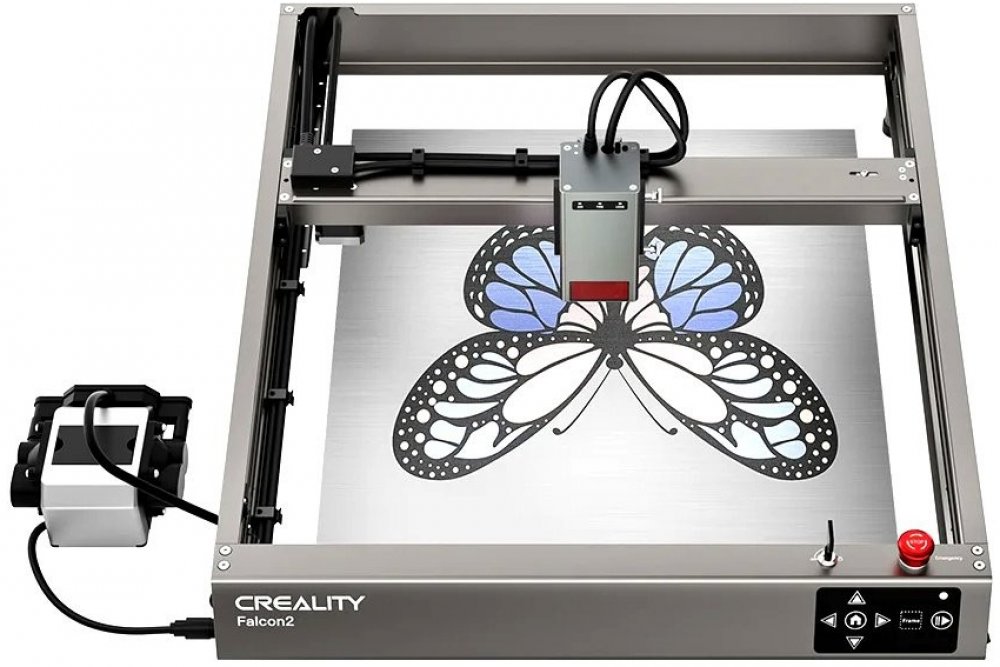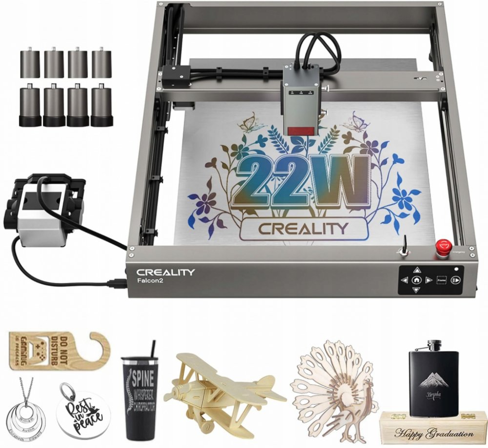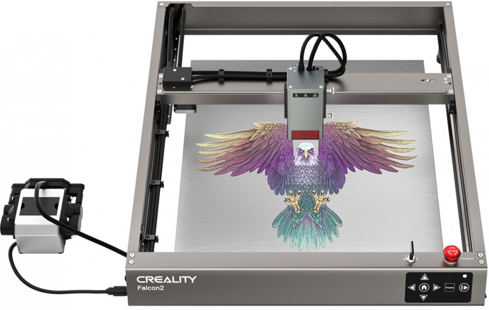 Creality Falcon2 je stroj pro gravírování a řezání různých materiálů. Disponuje velkou pracovní plochou o velikosti 400 x 415 mm, silným laserem výkonu až 22 W, s vlnovou délkou 455 nm a pevným zaostřením a přesností 0.1 mm. Stabilitu přístroje zajišťují protiskluzové podložky. K obsluze je možné využít programy Laser GRBL(zdarma) nebo LightBurn(nutno dokoupit).