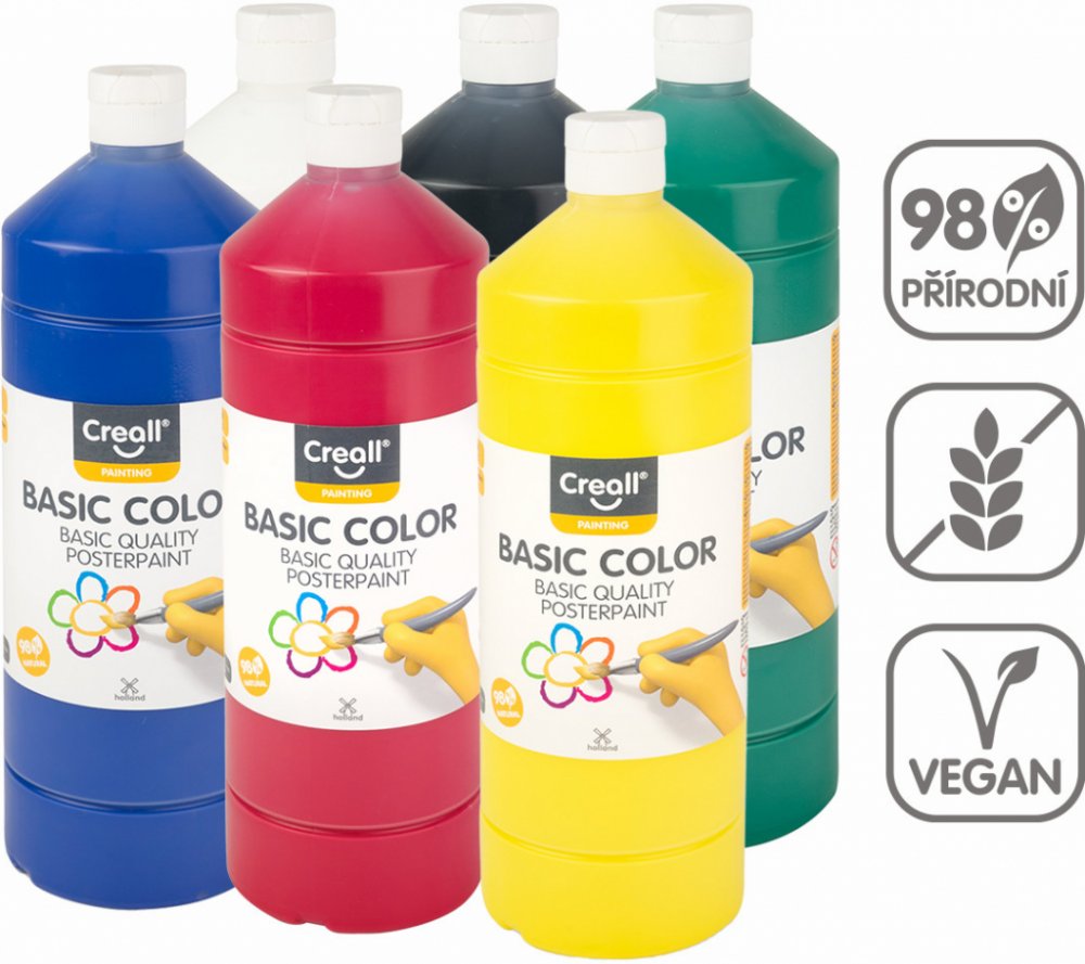 Kvalitní a vysoce krycí, vodou ředitelná barva. Obal s praktickým víčkem, zabraňující vysychání zároveň poskytuje snadnou manipulaci. Vhodná pro školy a výtvarné kroužky.98 % přírodních složek, splňuje normu EN-71vysoká krycí schopnost, dobrá přilnavostmatný vzhledvhodné i pro vrstvení barevmix barev: černá, bílá, žlutá, tm. červená, tm. zelená, tm. modráobjem: 1000 mlvyrobeno v Holandskuobsah bal...
