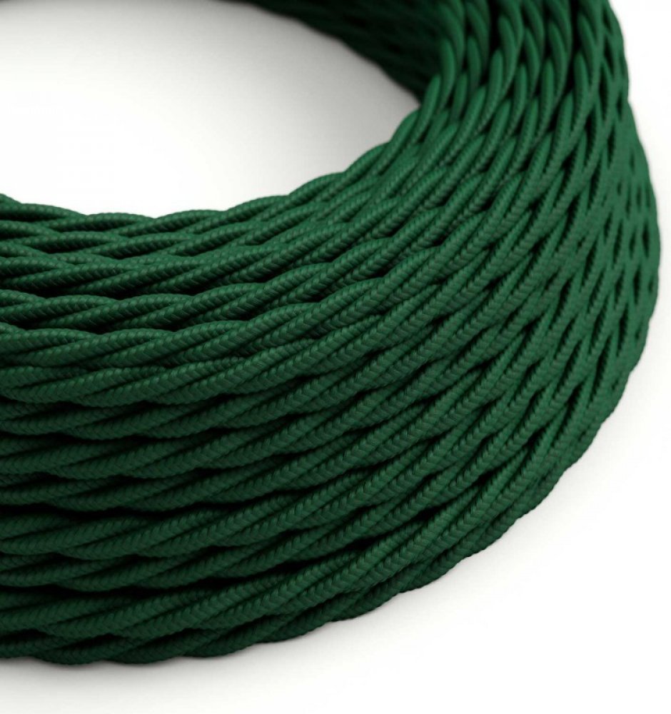 Zkroucený hedvábný textilní elektrický kabel TM21 Tmavě zelený FRRTX 300/300V 2x0,75 nebo 3x0,75 DVOJITÁ IZOLACE (dodatečné transparentní pouzdro) CEI 20-20 CEI 20-35 RoHS.
