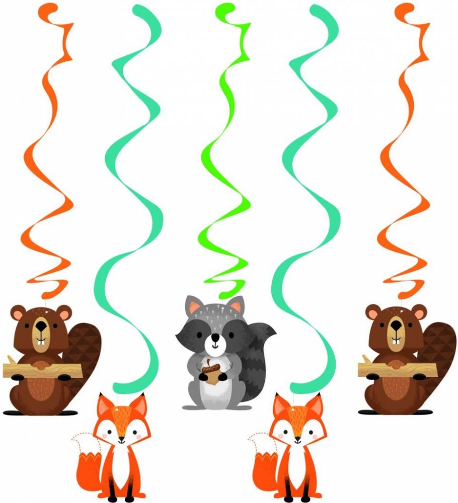 Pětidílná dekorace s liškami, mývalem a bobříky potěší všechny děti. Zvířátka se pohupují na fóliových spirálkách.