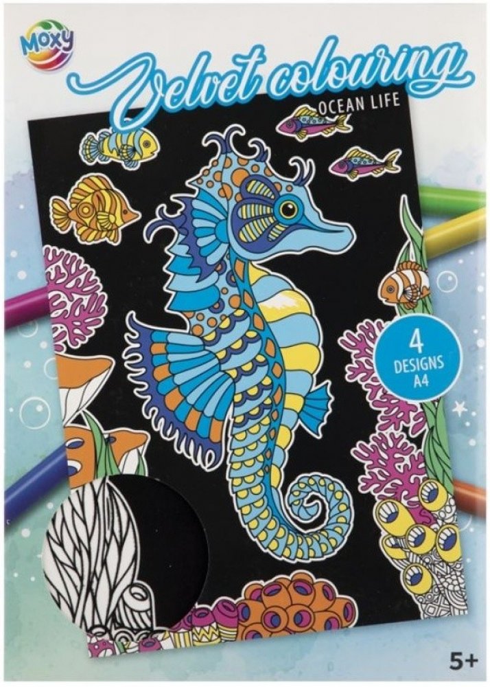 Omalovánky obsahují 4 jednotlivé obrázky na bílém papíru A4. Kontury a pozadí obrázku mají černý sametový povrch (velvet paper), vybarvuje se vnitřní část obrázků. Vhodné na fixy nebo pastelky. Motiv (mořský koník, ryby, želva).