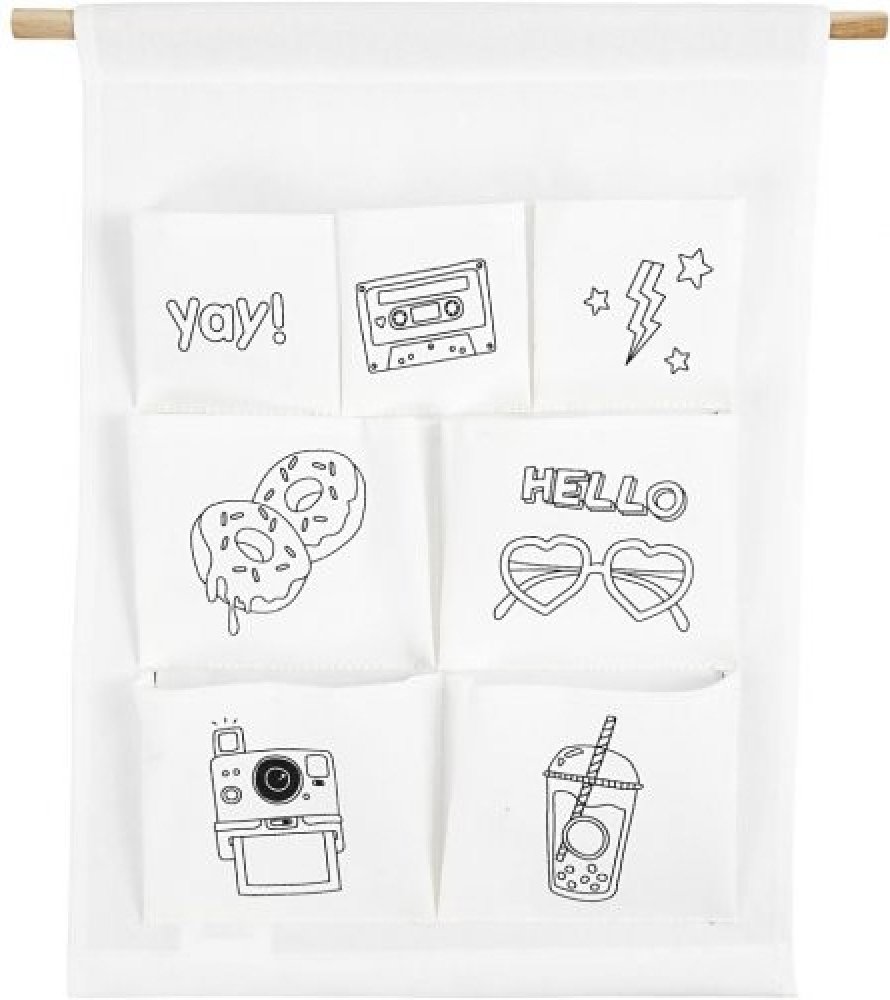 Buďte kreativní a barevně si přizpůsobte tento praktický organizér s atraktivními předtištěnými motivy. Použijte své oblíbené barevné fixy na textil, barvy na textil apod. Závěsný kapesní organizér z pevného plátna s plastovým podkladem a kanálem v horní části s dřevěným kolíkem na zavěšení. Ideální pro ukládání drobných předmětů. Předtištěné motivy lze snadno ozdobit fixem na textil nebo barvami na textil. Na přední straně je potisk teplem, protože zadní strana je potažena plastem.. Použijte jako úložný prostor pro kancelářské potřeby, nářadí, vlasové doplňky a mnoho dalšího Procvičte si pozornost a klid s projektem vybarvování Důvěra v použití předtištěného vzoru Přizpůsobte si, jak chcete.