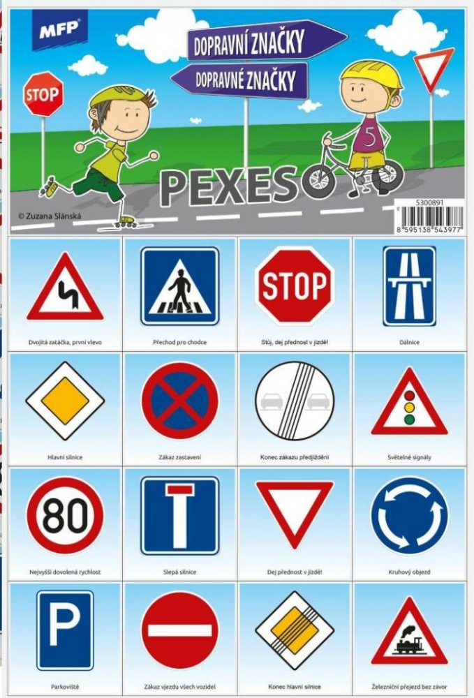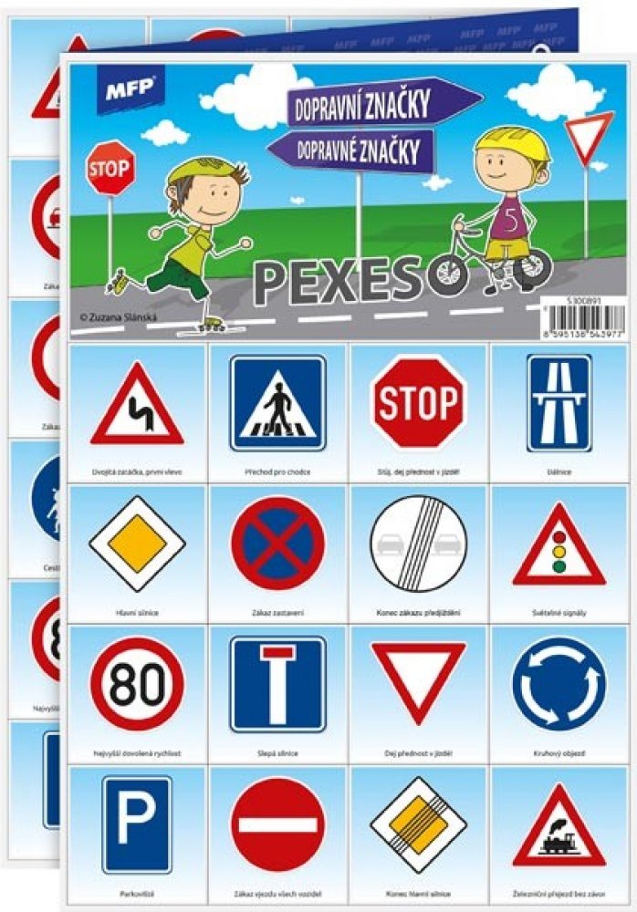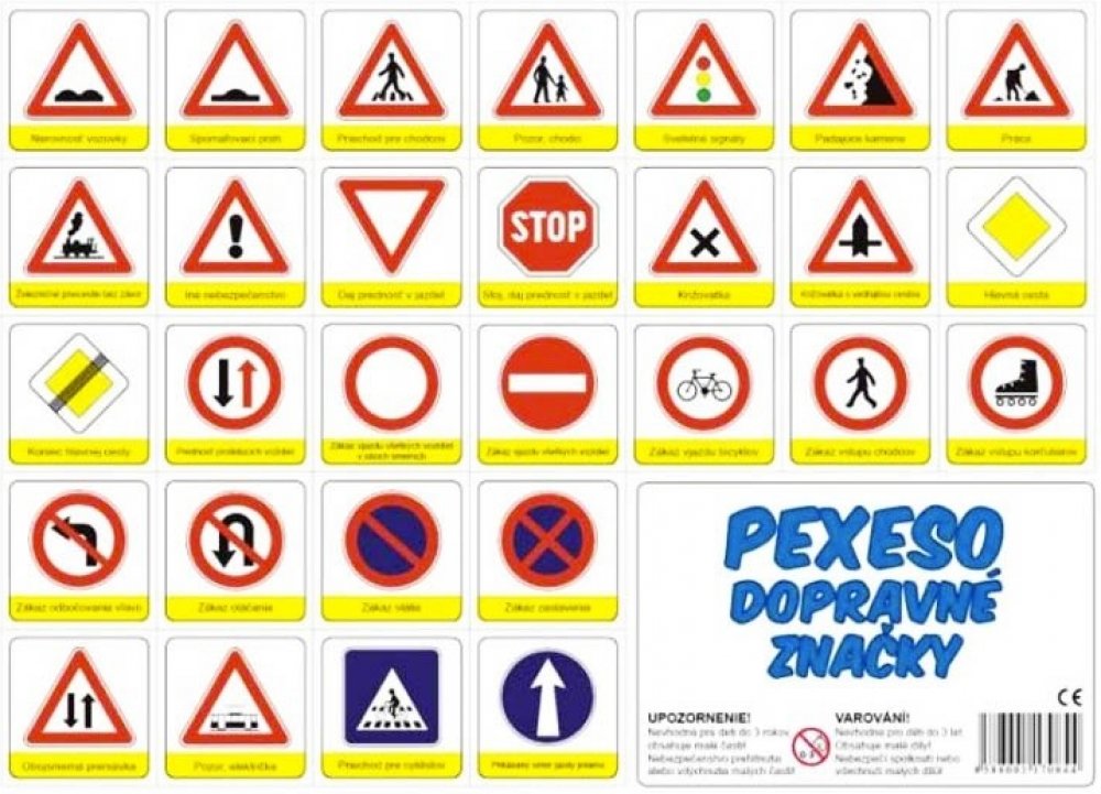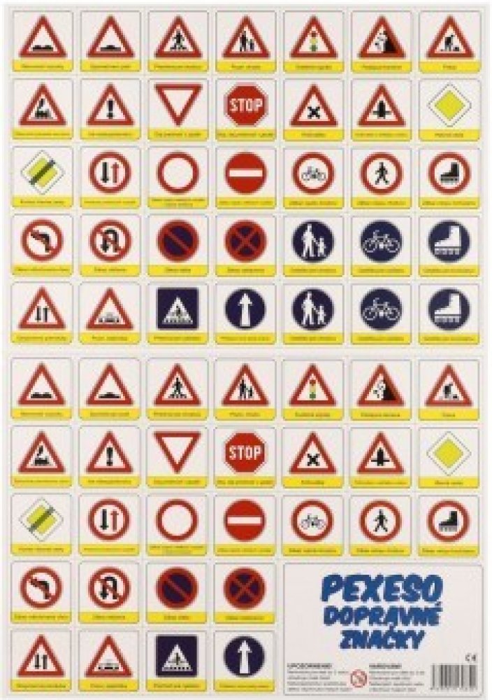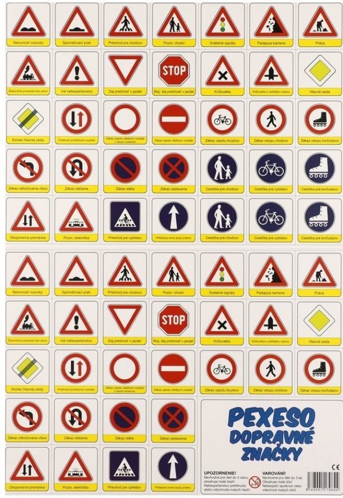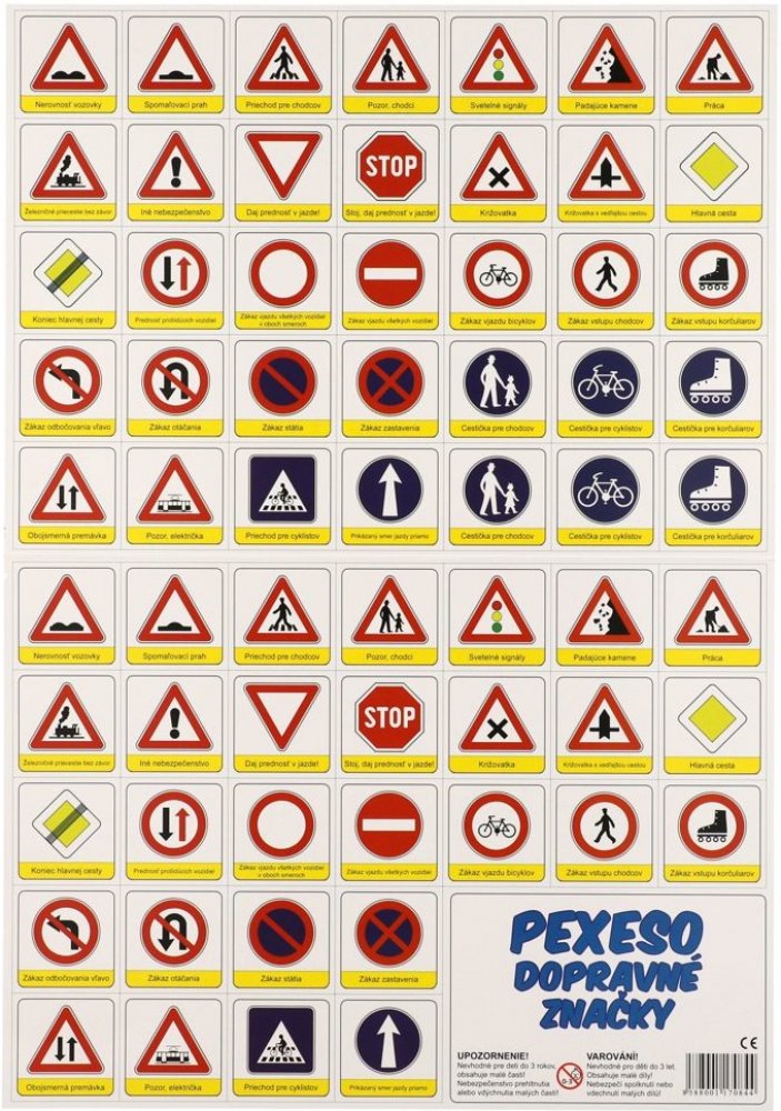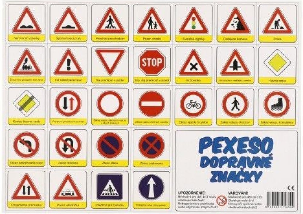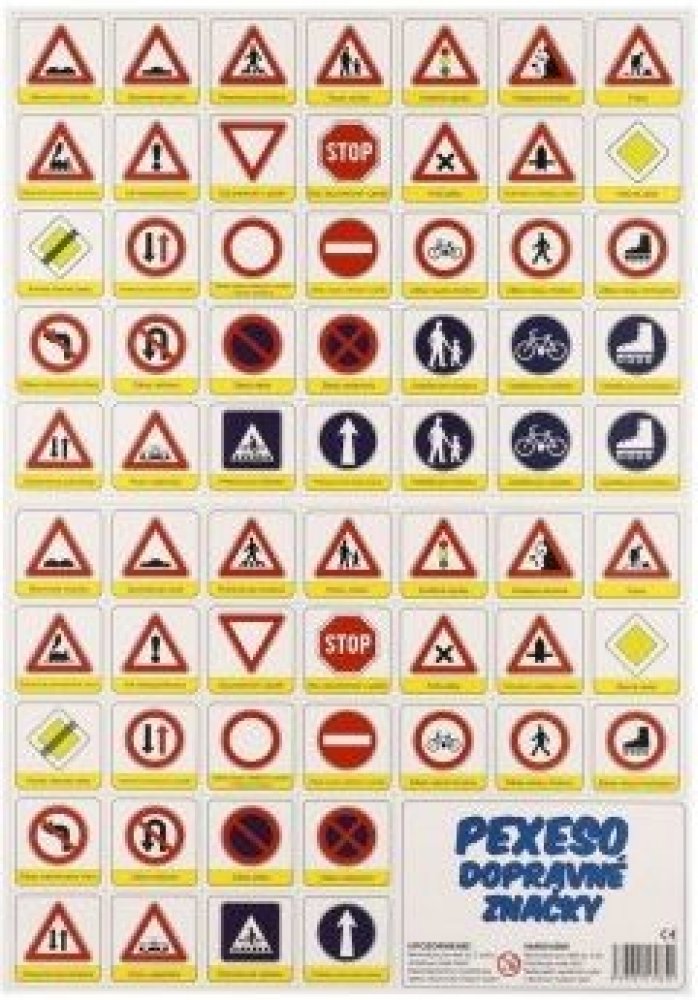 PEXESO je populární dětská stolní hra, která nikdy neomrzí a zapojit se můžou i dospělí. Pexeso - Dopravní značky - je vhodné pro děti, které se chtějí naučit poznávat dopravní značky, které na hodinách autoškoly budou umět s přehledem, 32 obrázkových dvojic.