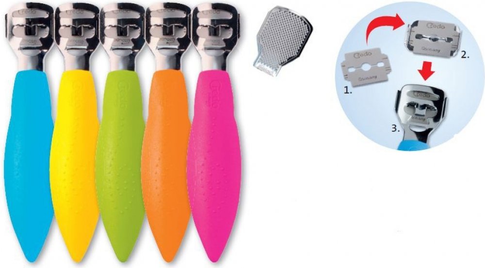 Credo Solingen originální seřezávač kůže s pilníkem je vyráběn v pěti moderních POP-ART barvách: oranžové, žluté, zelené, modré a růžové.