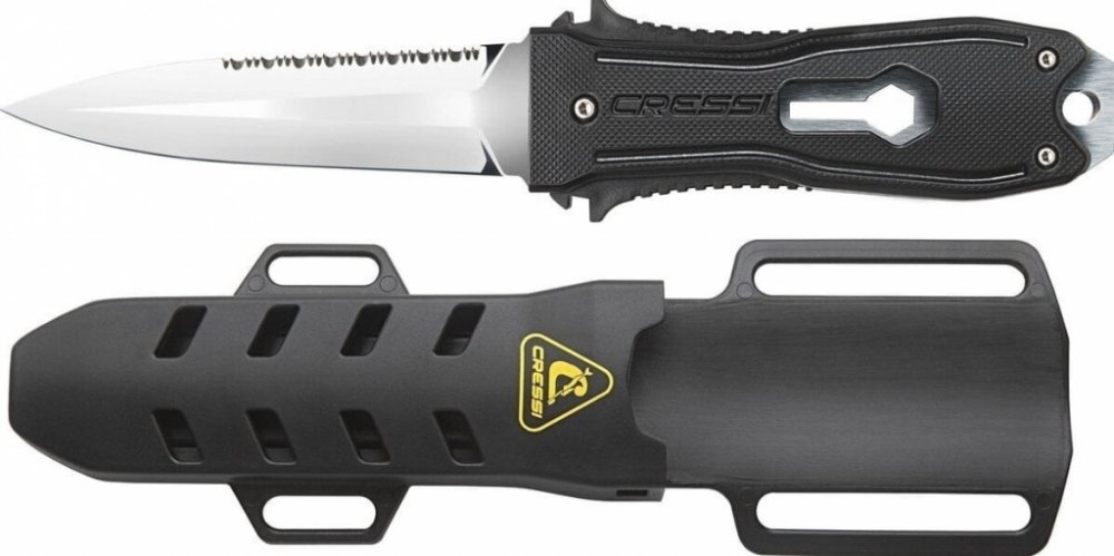 Tento víceúčelový nůž na potápění a podmořský rybolov je vyrobený z vysoce kvalitní nerezové oceli a má mimořádně ostrou čepel. Podmořští lovci jistě ocení uvolňovač šípů integrovaný do střenky nože, který ulehčuje vytahování harpunových šípů. Potápěčský nůž, vyrobený v Itálii. Čepel a střenka z martenzitické nerezové oceli w 1. 14116, tvrdost 55/56 HRC.|Otvor ve střence nože slouží k uvolnění zas...
