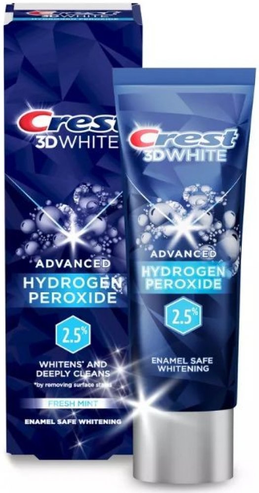 Bělící zubní pasta Crest 3D White ADVANCED 2,5% Hydrogen Peroxide s příchutí Fresh Mint je mimořádně účinnou bělící zubní pastou a to díky obsahu 2,5% hydrogenperoxidu. Pasta efektivně bělí zuby a zároveň je k zubní sklovině velmi šetrná.