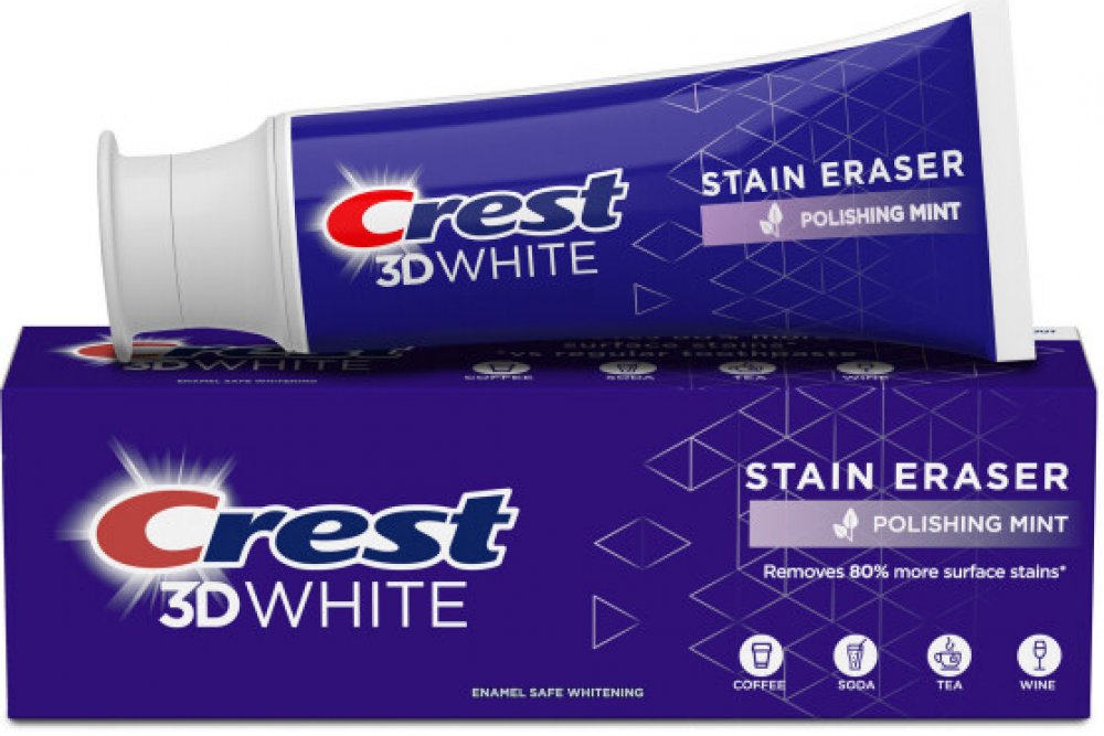 Bělicí zubní pasta Crest 3D White STAIN ERASER Polishing Mint odstraňuje až o 80 % více skvrn ze zubů způsobených vínem, kávou, čajem a dalšími nápoji a jídly ve srovnání s jinými bělicími zubními pastami na trhu. Je skvělým pomocníkem při udržování bělejších zubů i během samotného procesu bělení.