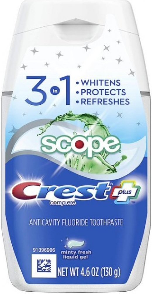 Tekutý zubní gel Complete Plus Scope 3 in 1 Teeth Whitening s bělící složkou představuje směs zubních past Crest a ústní vody Crest Scope. Spojuje účinek zubní pasty a ústní vody, což zaručuje kompletní ochranu dutiny ústní.